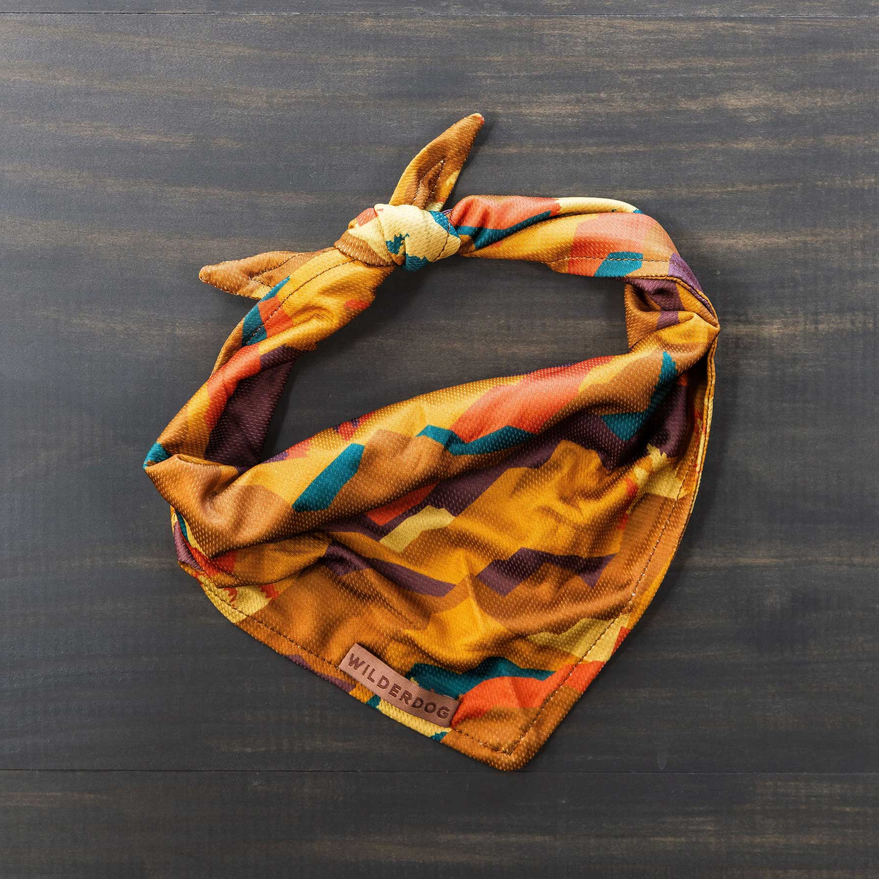 The Autumn Air Bandana, adorned with an abstract pattern in vibrant shades of orange, yellow, and teal, is neatly folded on a dark wooden surface. Perfect as part of your dog&