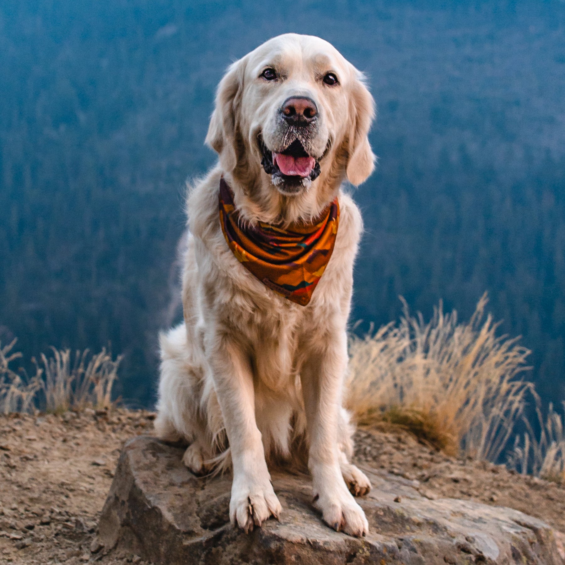 A golden retriever with a cheerful expression, wearing the Autumn Air Bandana in orange and black, sits on a rocky surface with a blurred backdrop of mountains and dry grass. The dog&