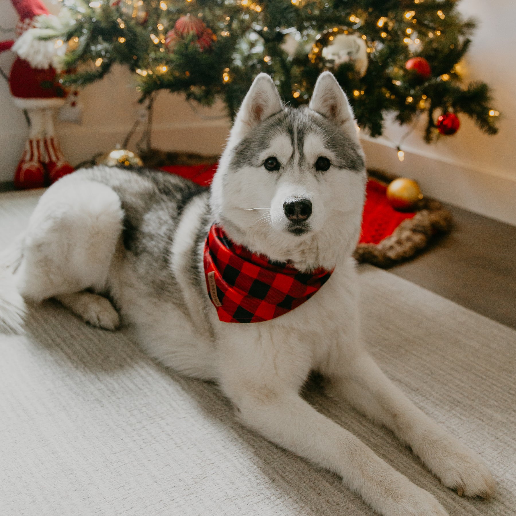 A husky wearing a Buffalo Plaid Bandana lounges on a rug in front of a Christmas tree sparkling with lights and ornaments, while a Santa figure subtly peeks from the background, capturing the holiday season&