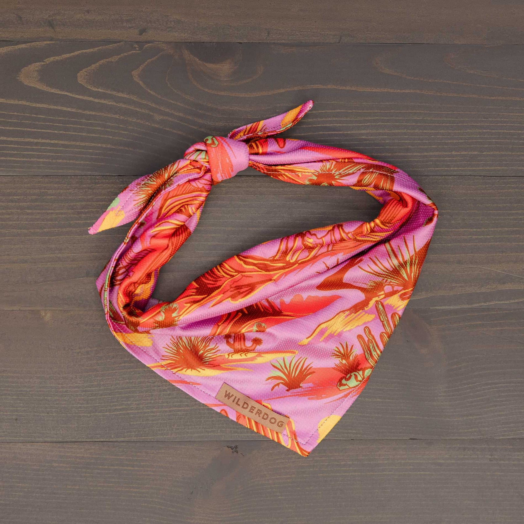 The Laramie Bandana is a lightweight, quick-drying dog accessory with pink and orange desert-themed patterns. "Wilderdog" is printed on one corner. Shown tied in a knot and laid flat on a dark wooden surface.