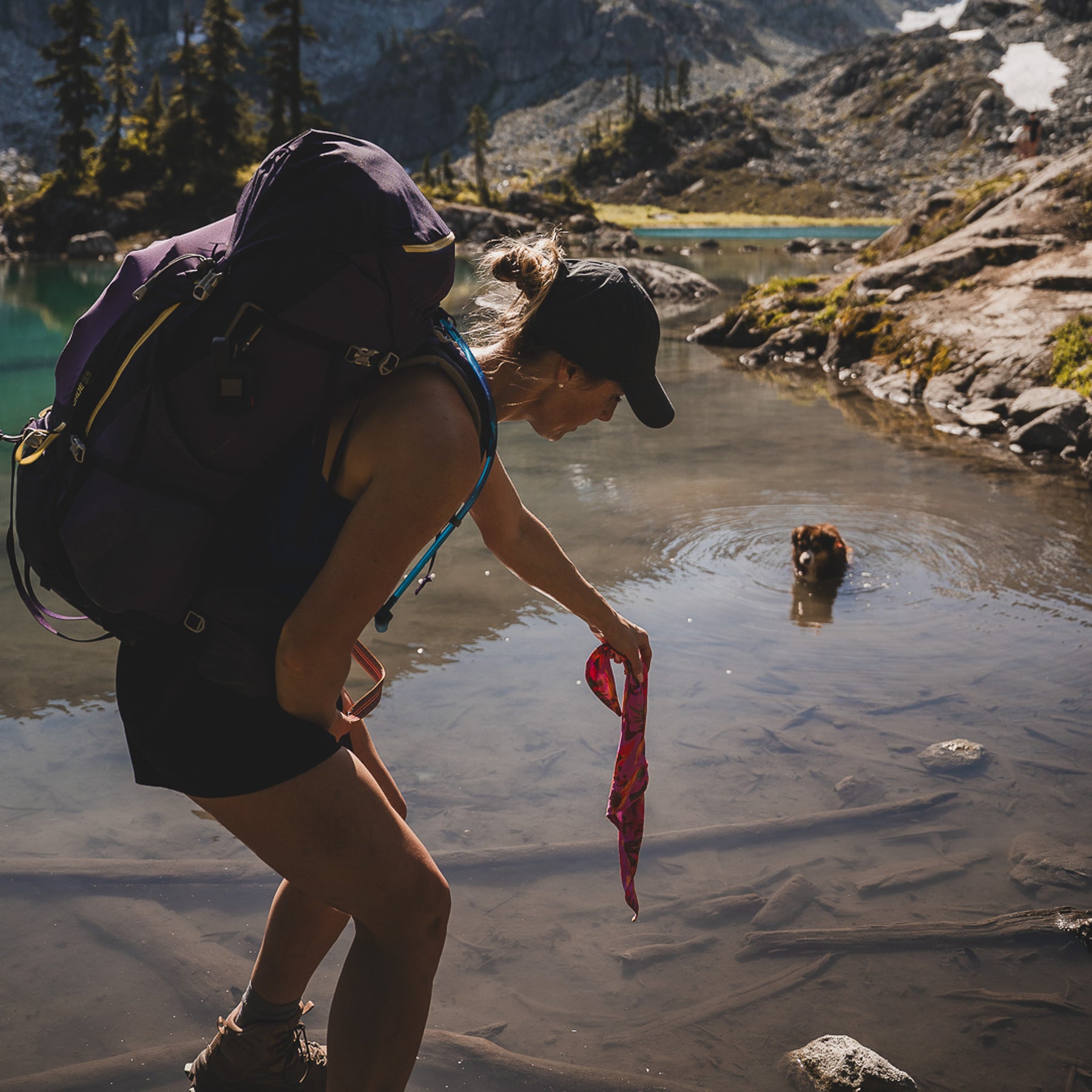 A woman with a backpack stands by a mountain lake, holding a Laramie Bandana in pink as her dog wades nearby. Trees and mountains frame the scenic, bright landscape.