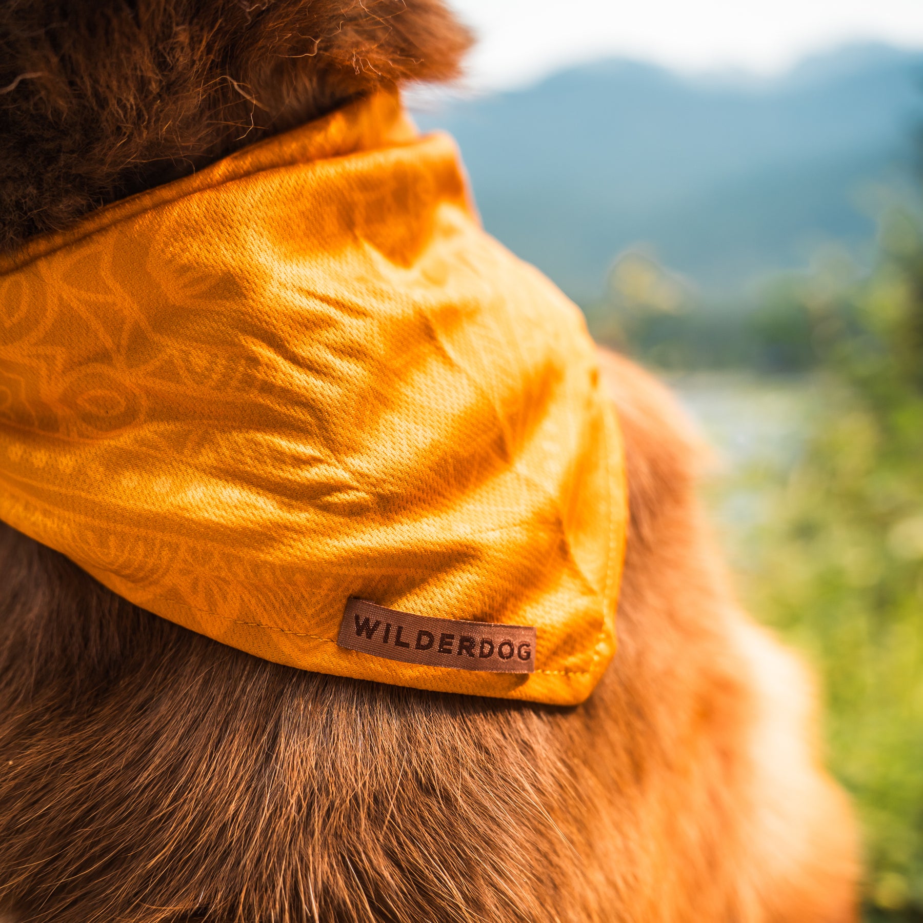 A mustard-colored cooling bandana is tied in a knot at the top, featuring a branded "Wilderdog" tag at the bottom edge. Ideal for dog trail accessories, it is displayed flat on a dark wooden surface.