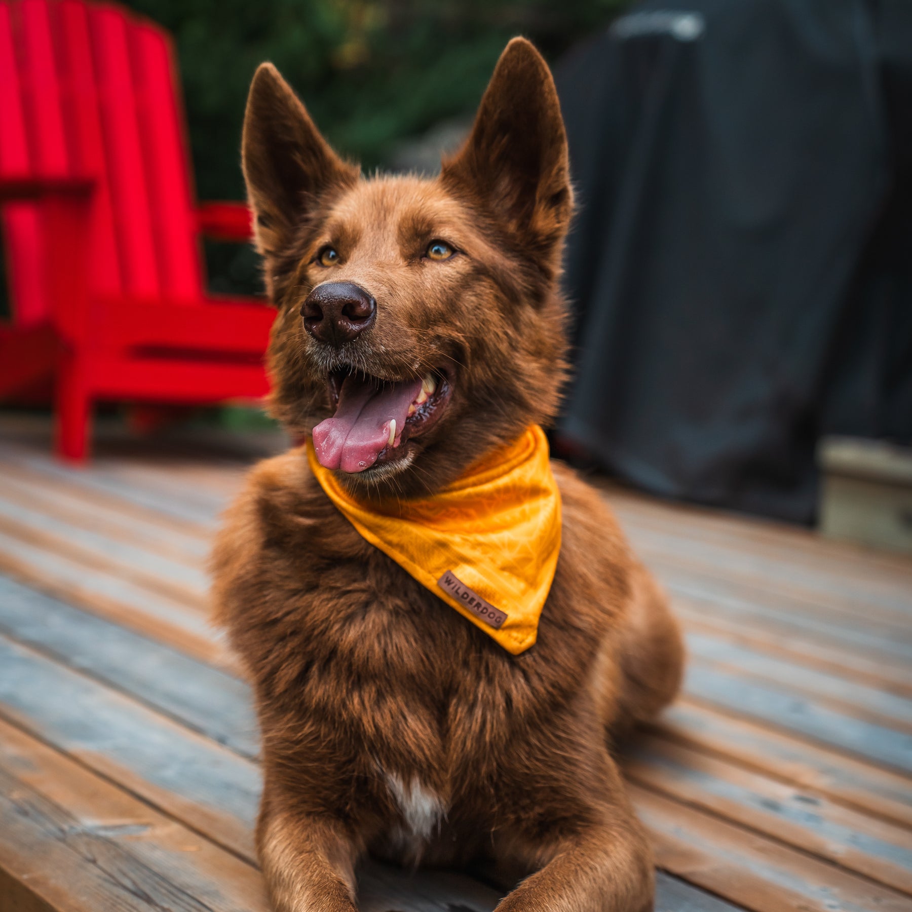 A fluffy brown dog with perky ears is lying on a wooden deck. The dog, sporting a quick-drying fall Mustard Bandana, has its mouth open, tongue hanging out, appearing happy. In the background, there is a bright red Adirondack chair and a black grill cover.