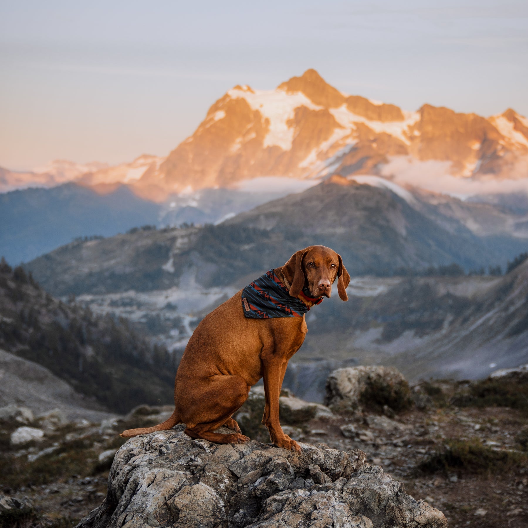 Brown dog in Olive Bandana sits on rocky terrain, snow-capped mountains and golden light behind.