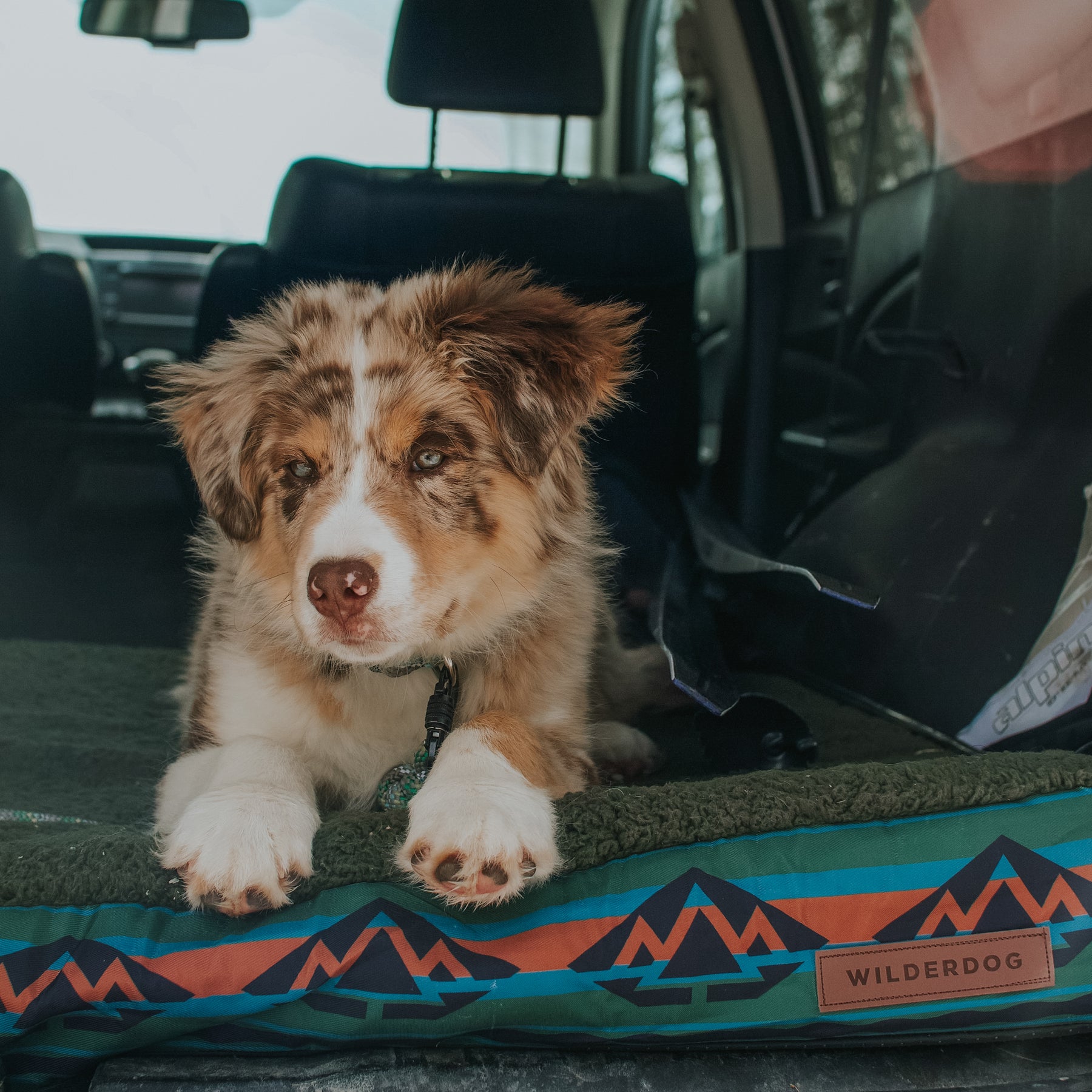 Fluffy brown and white puppy on a mountain design blanket, resting on a Memory Foam Dog Bed in a car