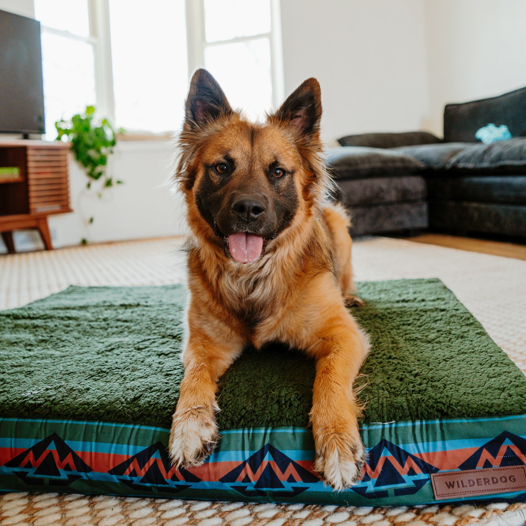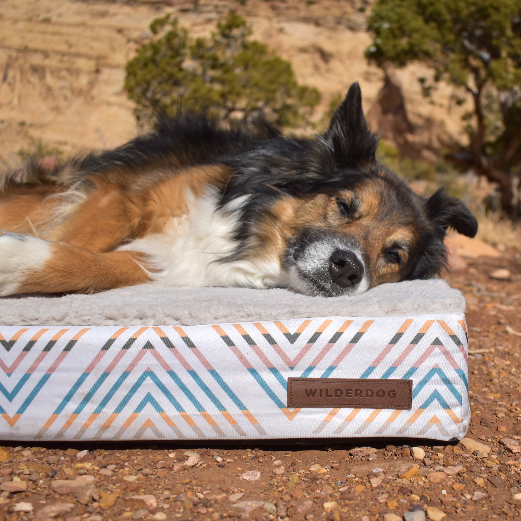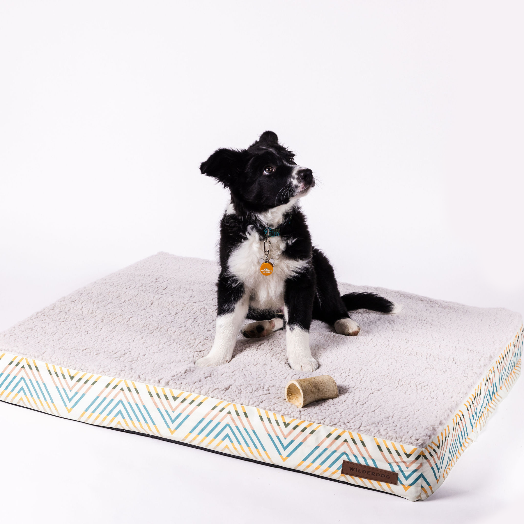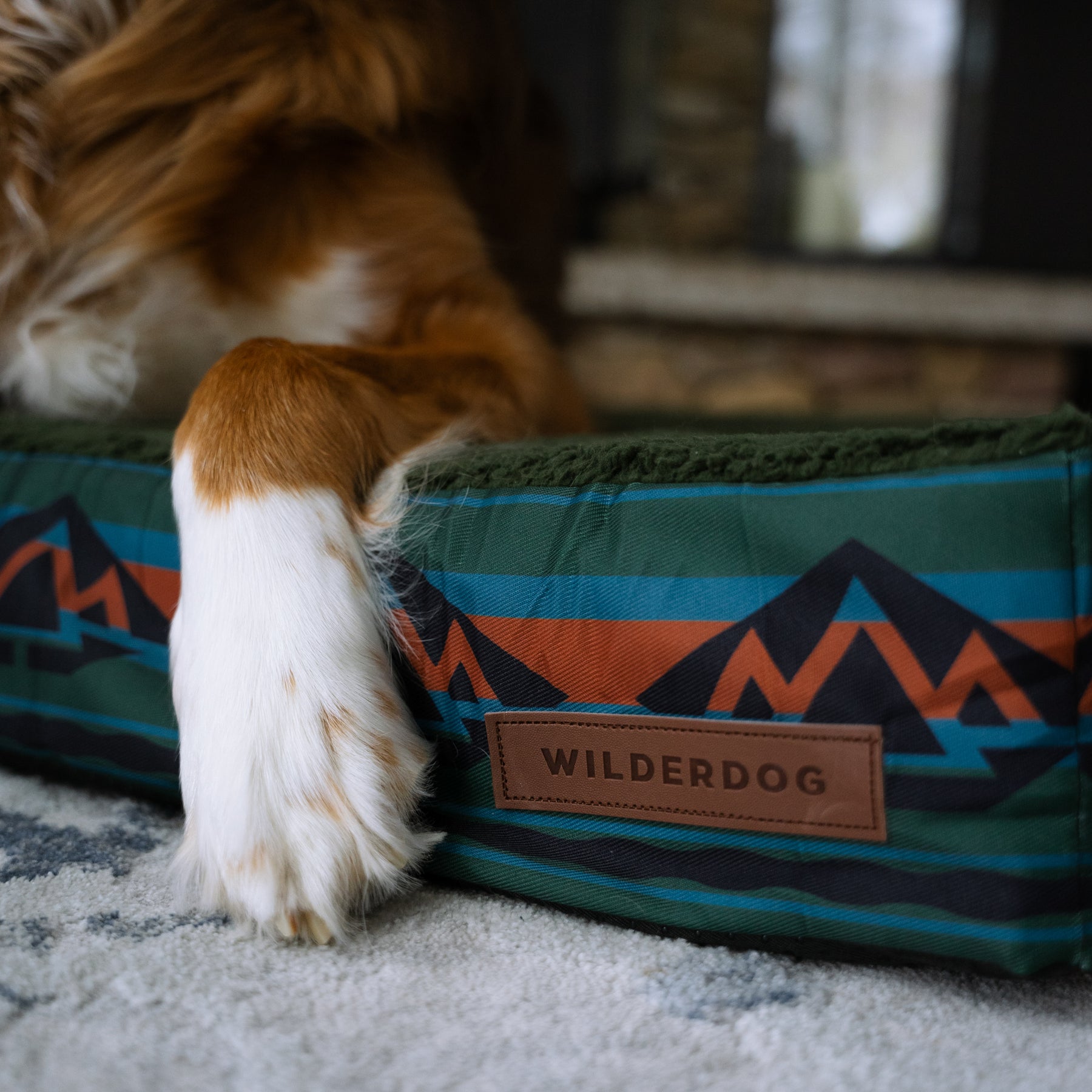 A close-up of the Memory Foam Dog Bed showcases its rectangular shape, a shaggy white top, and colorful geometric zigzag patterned sides in shades of blue, yellow, and green. A brown leather tag displaying the brand name "Wilderdog" is sewn on one side. The bed offers joint support and includes a washable cover.