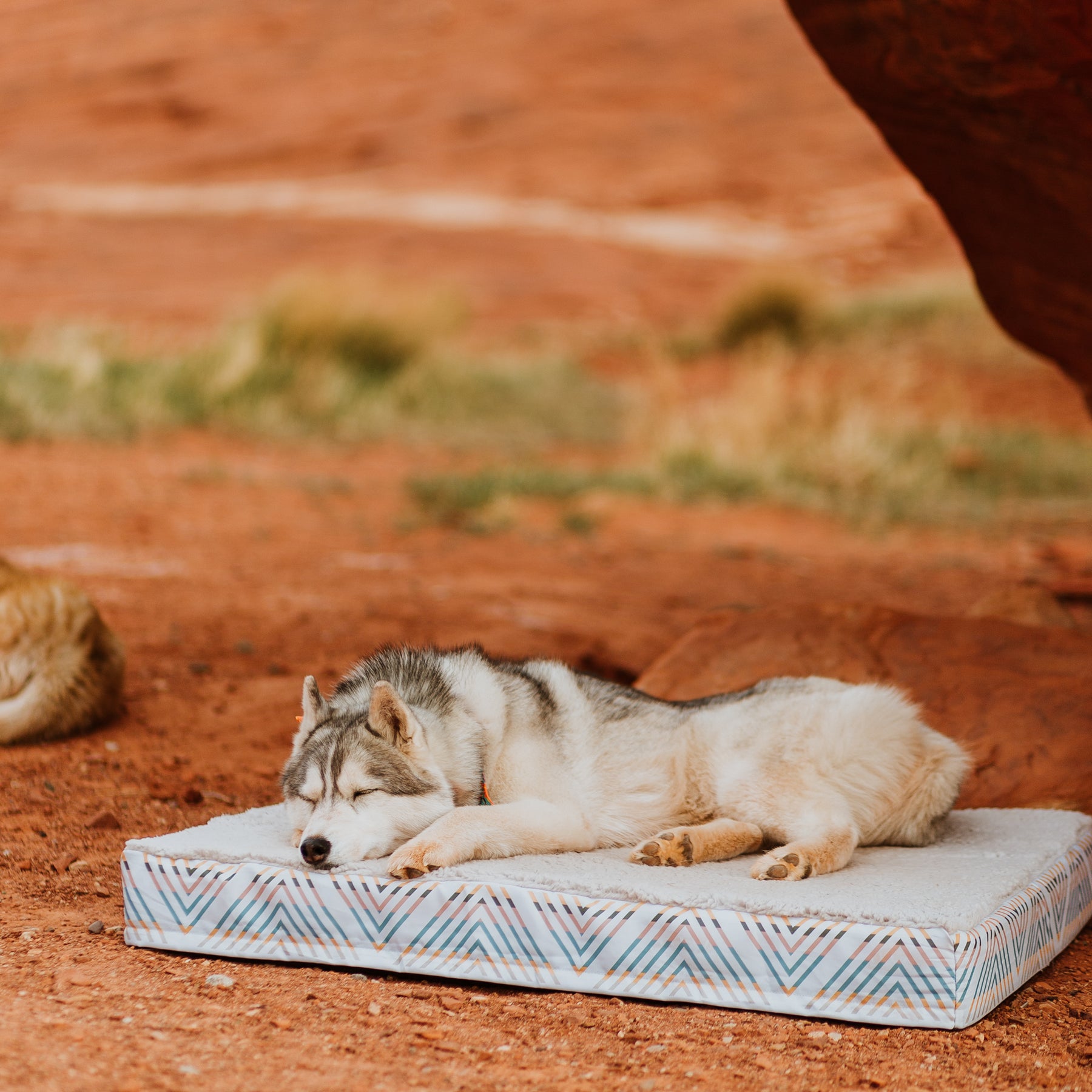 A gray and white dog sleeps peacefully outside on a blue and white patterned Memory Foam Dog Bed. The surrounding terrain is red and arid, with a large rock formation partially visible in the background. Another dog is partially visible lying down nearby, also enjoying the comfort of its Memory Foam Dog Bed&
