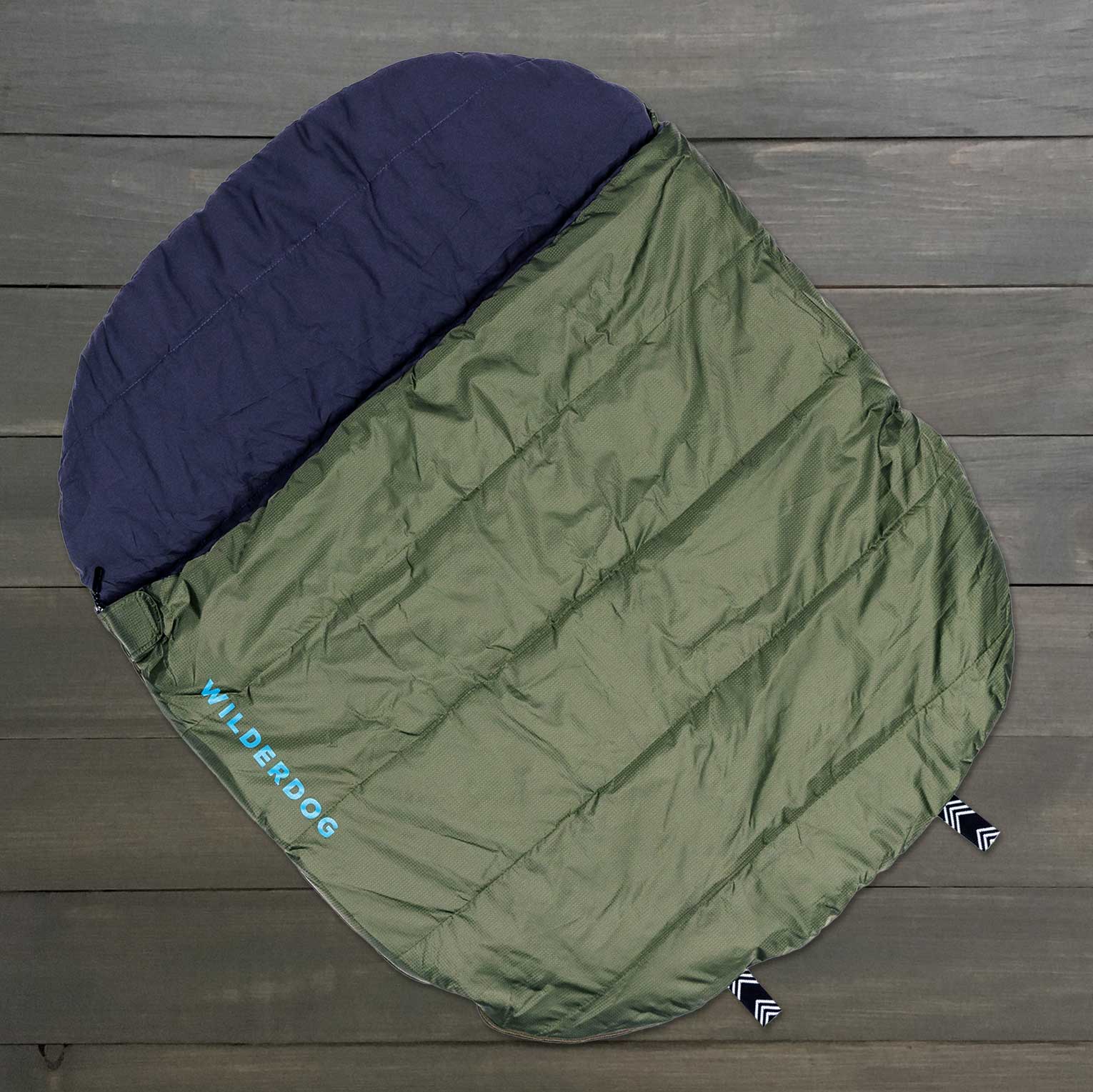 A green and navy "Wilderdog" sleeping bag in a rectangular quilted design rests on a wooden surface. Made from durable ripstop polyester, it&