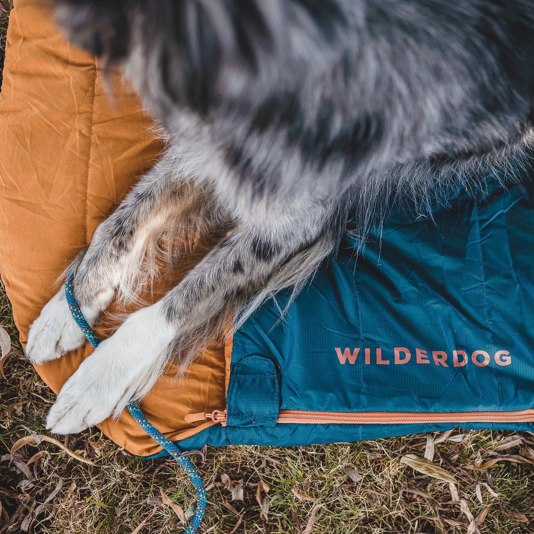A dog with a fluffy gray and white coat lies on a two-toned Sleeping Bag featuring orange and blue sections. Made of durable polyester, it is suitable for indoor and outdoor use. A blue rope is also visible near the dog&