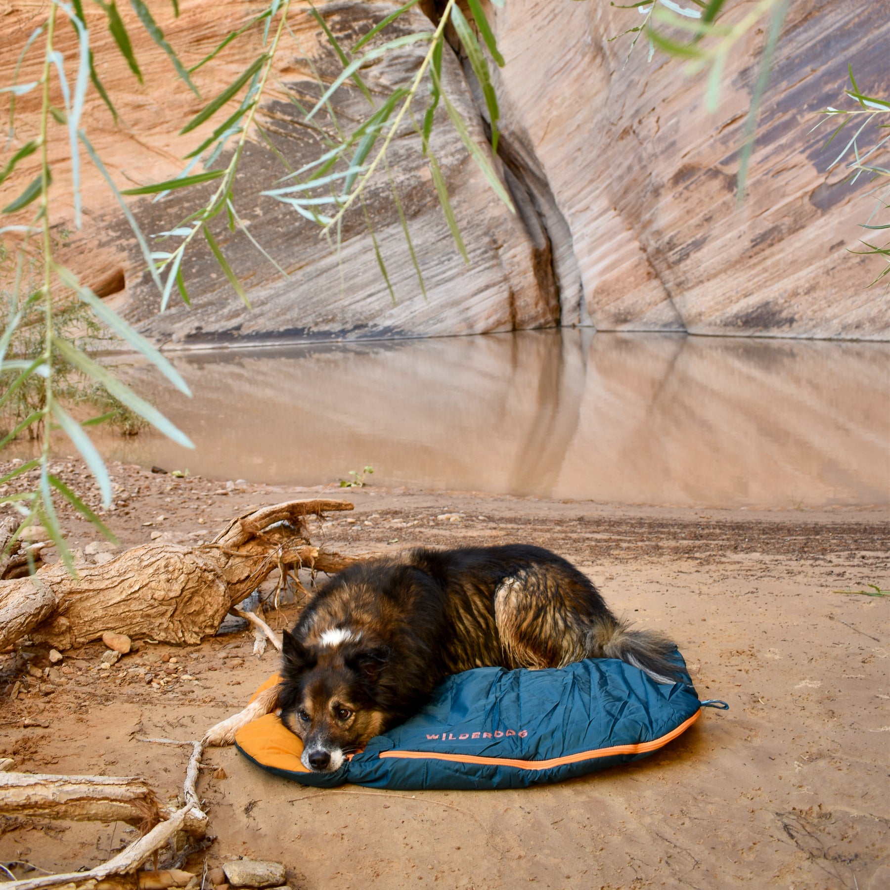 A fluffy dog rests on a durable polyester Sleeping Bag on sandy ground near a calm water body with tall, smooth rock formations in the background. Overhanging branches with green leaves frame the upper edges of the picture.