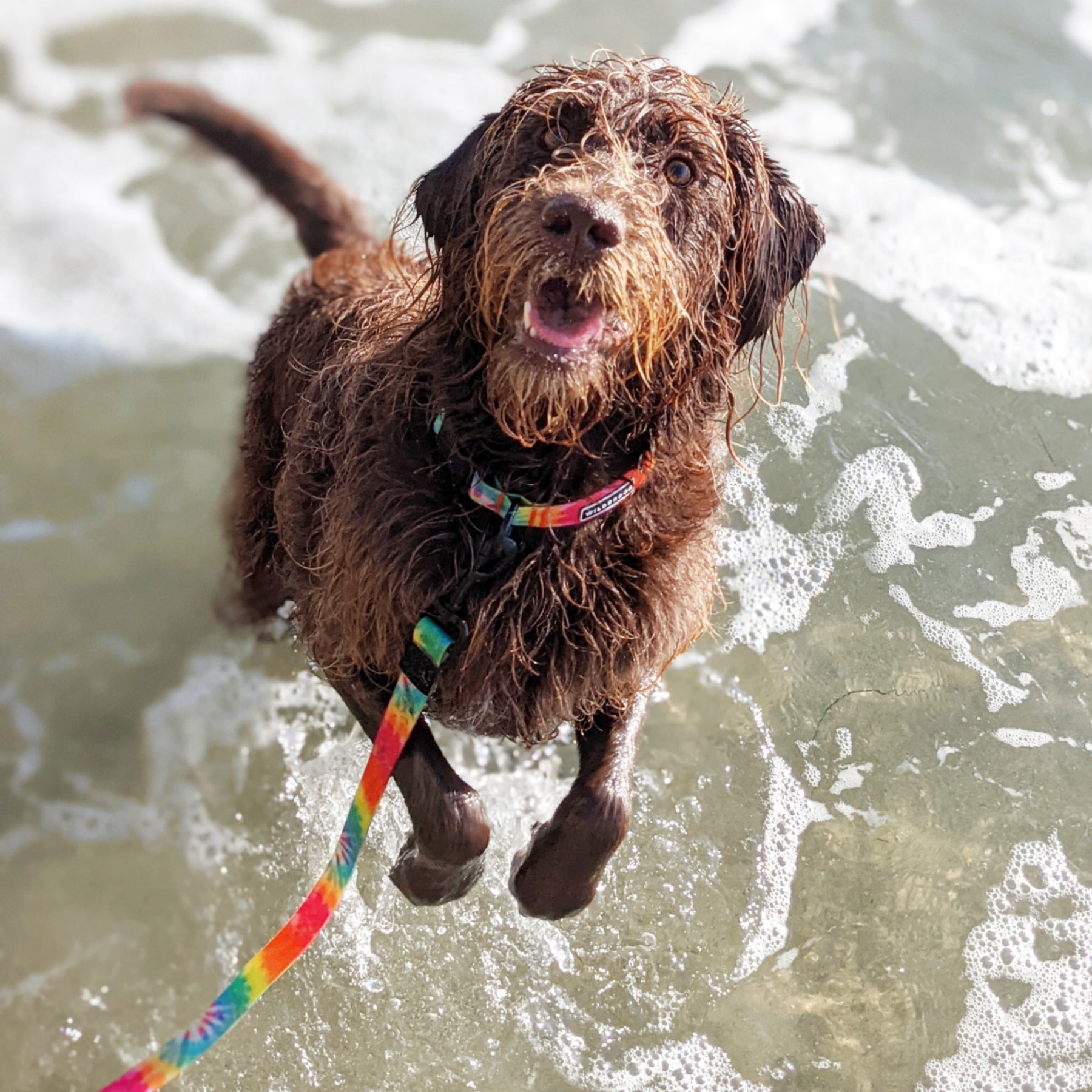 A wet, shaggy brown dog stands in shallow ocean water, looking up happily with its mouth open and tongue out, wearing the Tie Dye Waterproof Leash + Collar Bundle (x), which is colorful and stink-proof.