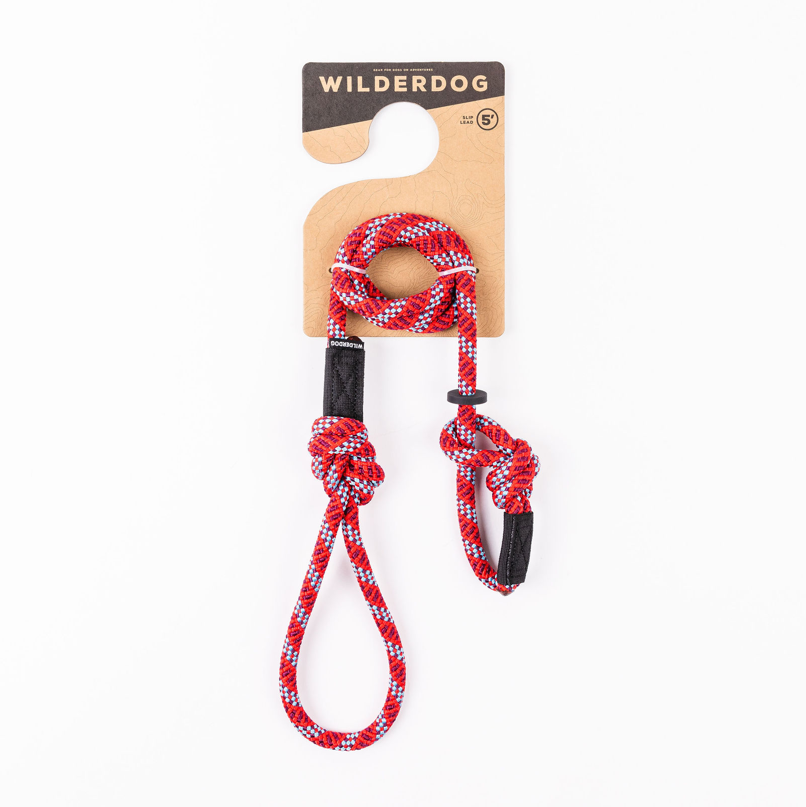 A Maple Slip Lead, featuring a red and white rock climbing rope with black accents, is displayed on a white background. The packaging reads "Wilderdog" and displays a small dog icon. This durable dog slip lead has a loop handle and includes sturdy knots and clasps for secure fastening.