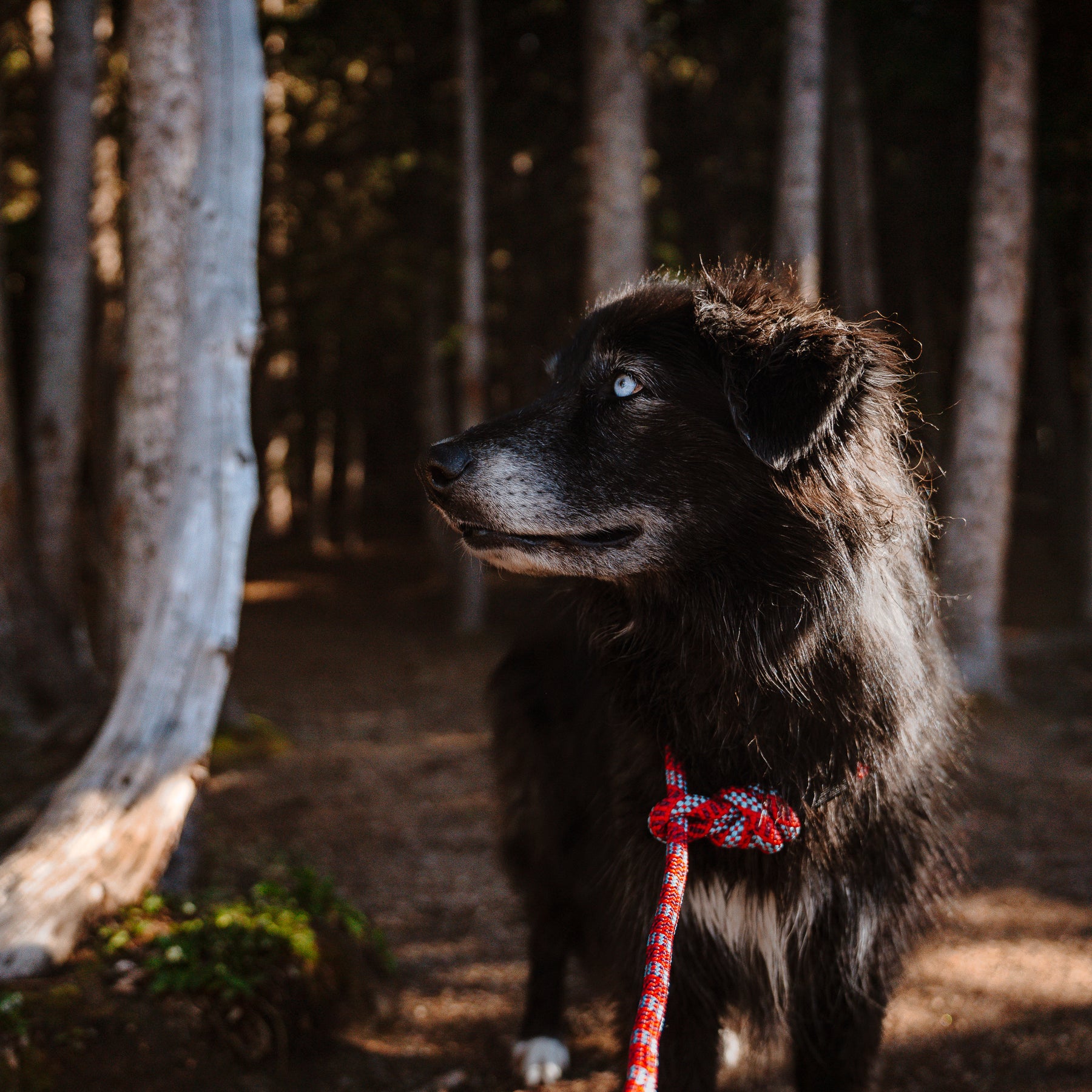 A black dog with light-colored eyes, wearing a Maple Slip Lead, stands in a forest. The dog looks attentive and slightly towards the side, with sunlight filtering through the trees in the background.