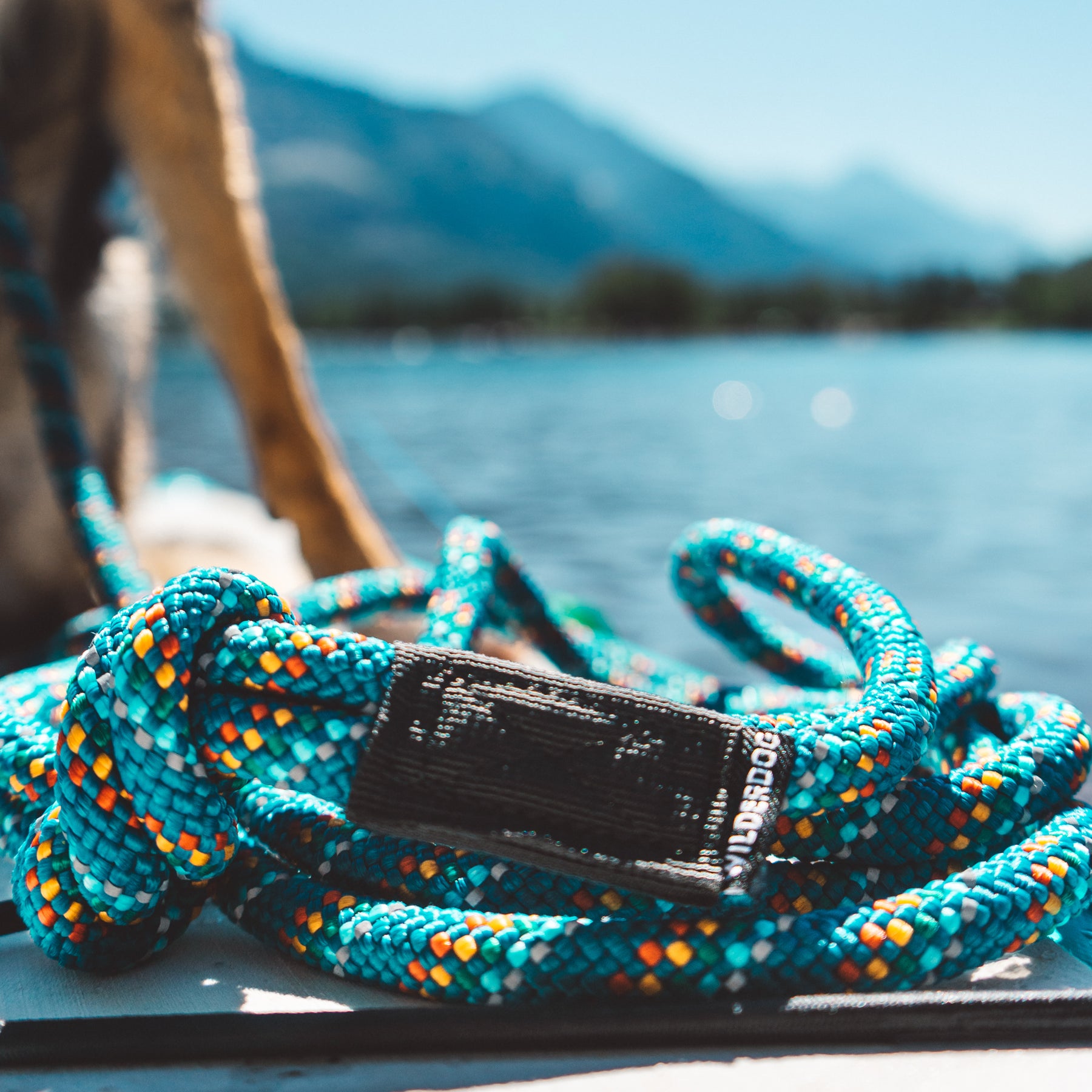 A colorful, braided Pacific Blue Reflective Slip Lead lies coiled on a dock with a lake and distant mountains blurred in the background. The rope features blue, orange, and white patterns, adding vibrancy to the serene outdoor scene.