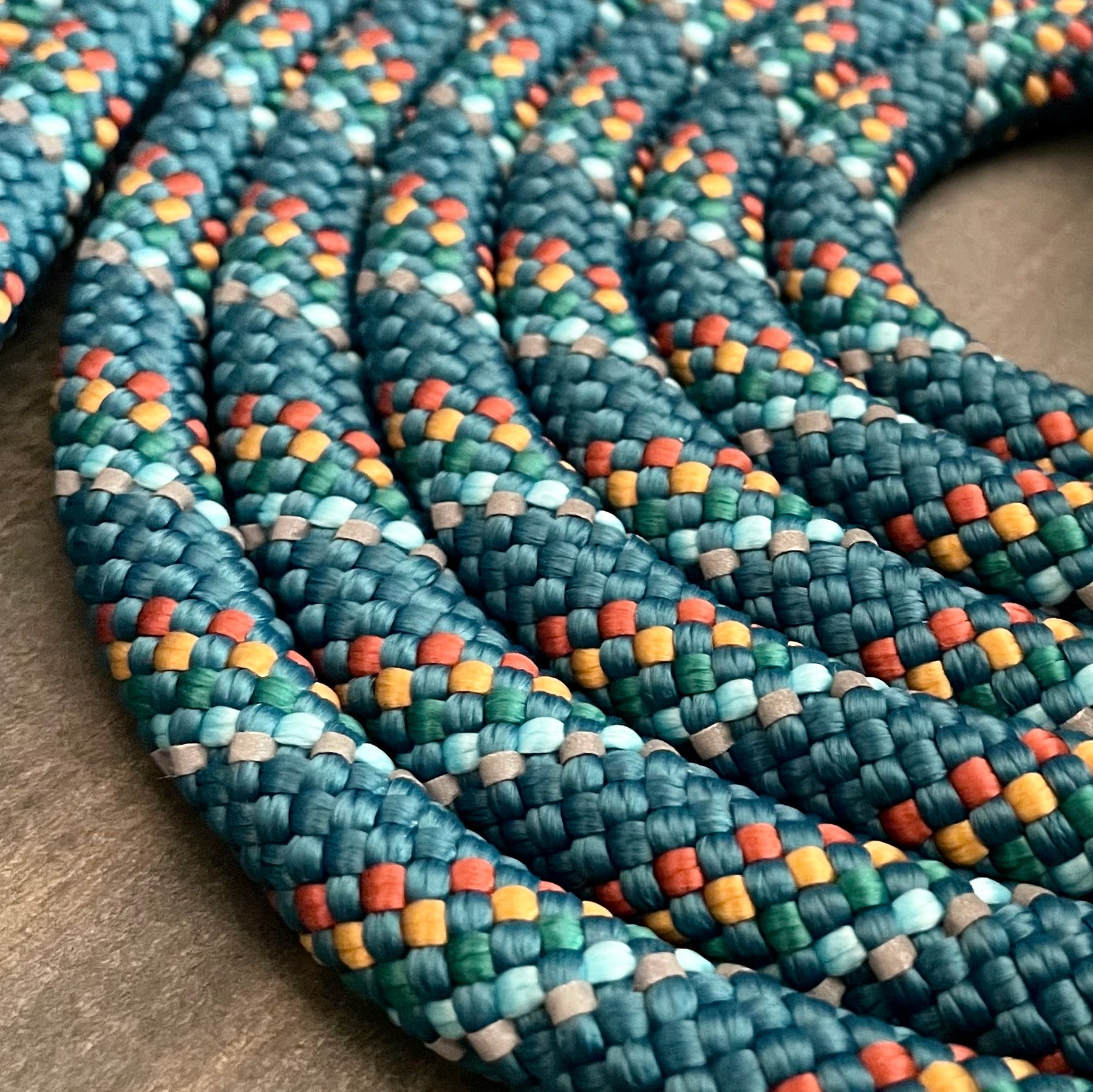 Close-up of the Pacific Blue Reflective Slip Lead featuring tightly woven patterns in blue, orange, light blue, and white. The detailed texture and vibrant colors are prominently depicted, emphasizing its strength and reliability—a dynamic and visually engaging representation of this durable dog leash.