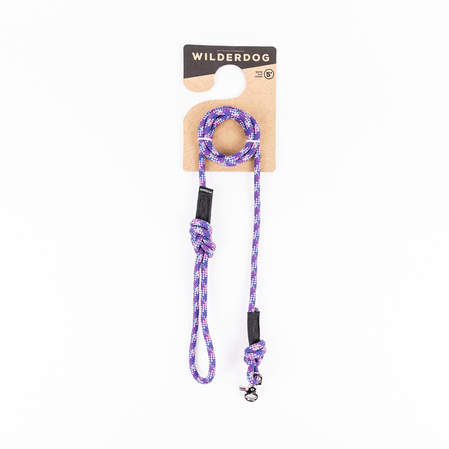 The Razzleberry Reflective Quick Clip Leash, featuring a purple and white pattern, durable construction, loop handle, and metal clasp, is displayed on brown cardboard backing. The brand name "Wilderdog" is printed in white at the top of the cardboard.