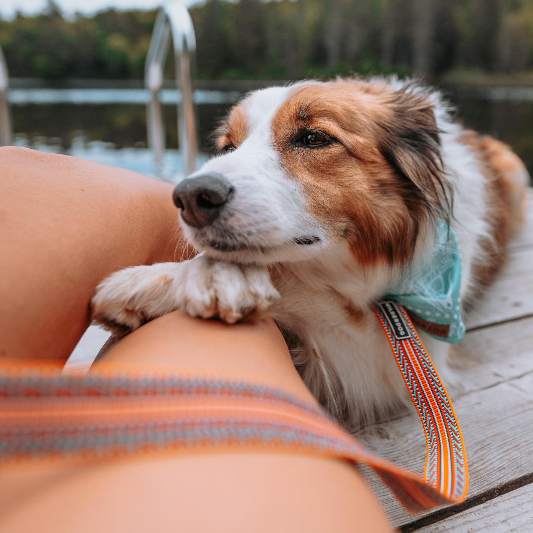 A dog wearing a multicolored collar and a blue bandana, complemented by the Sienna Ultralight Leash—known for its strong nylon webbing and swiveling carabiner attachment—relaxes with its paws resting on a person’s legs. The scene unfolds outdoors on a wooden deck near a body of water, surrounded by trees. The person is dressed in shorts and a swimsuit top.