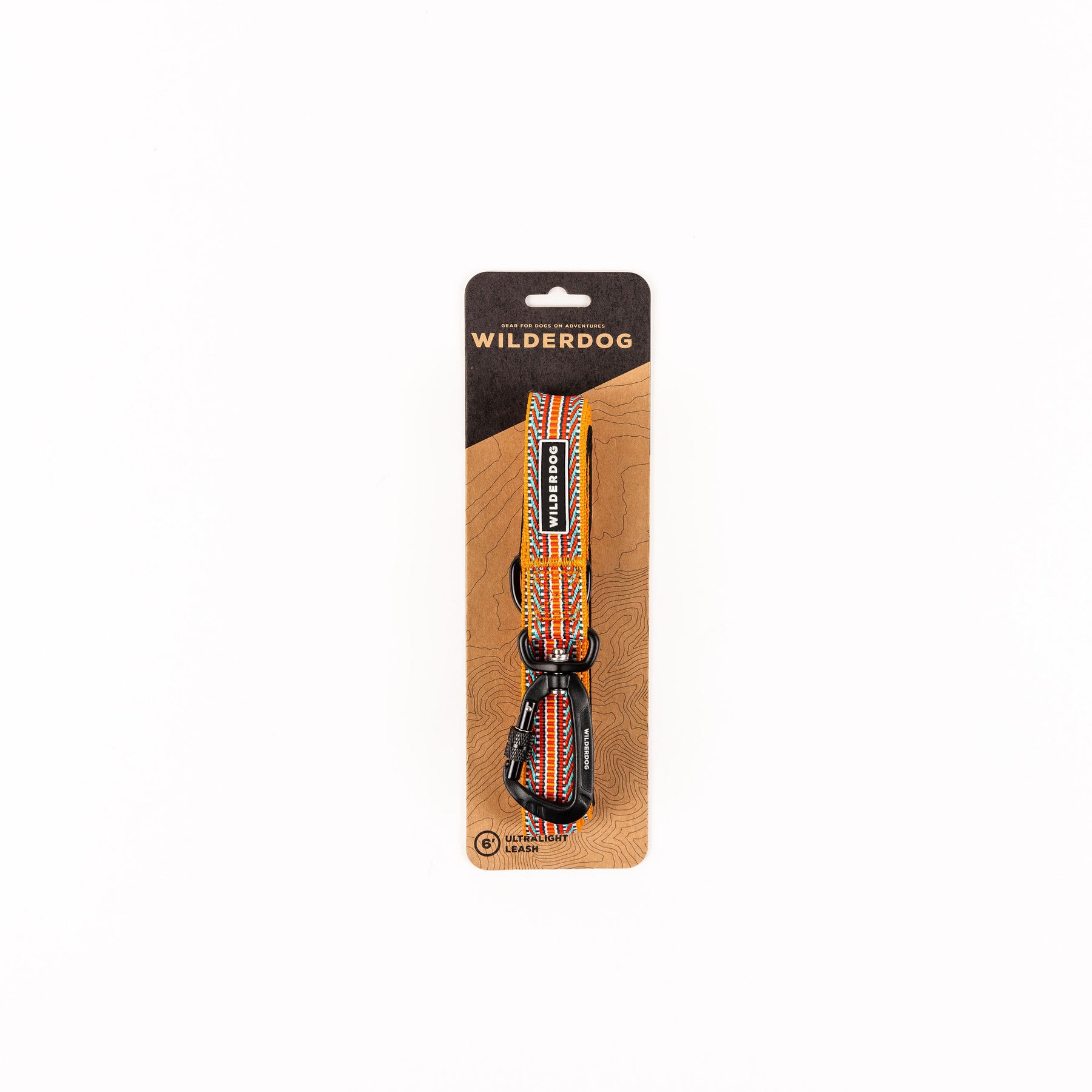 The Sienna Ultralight Leash, a vibrant and durable accessory made from strong nylon webbing, is laid out on a dark wood surface. This stylish leash features orange, yellow, and red patterns woven into its design. It includes a swiveling carabiner attachment for easy use, a metal D-ring for added functionality, and proudly displays the "Wilderdog" label.