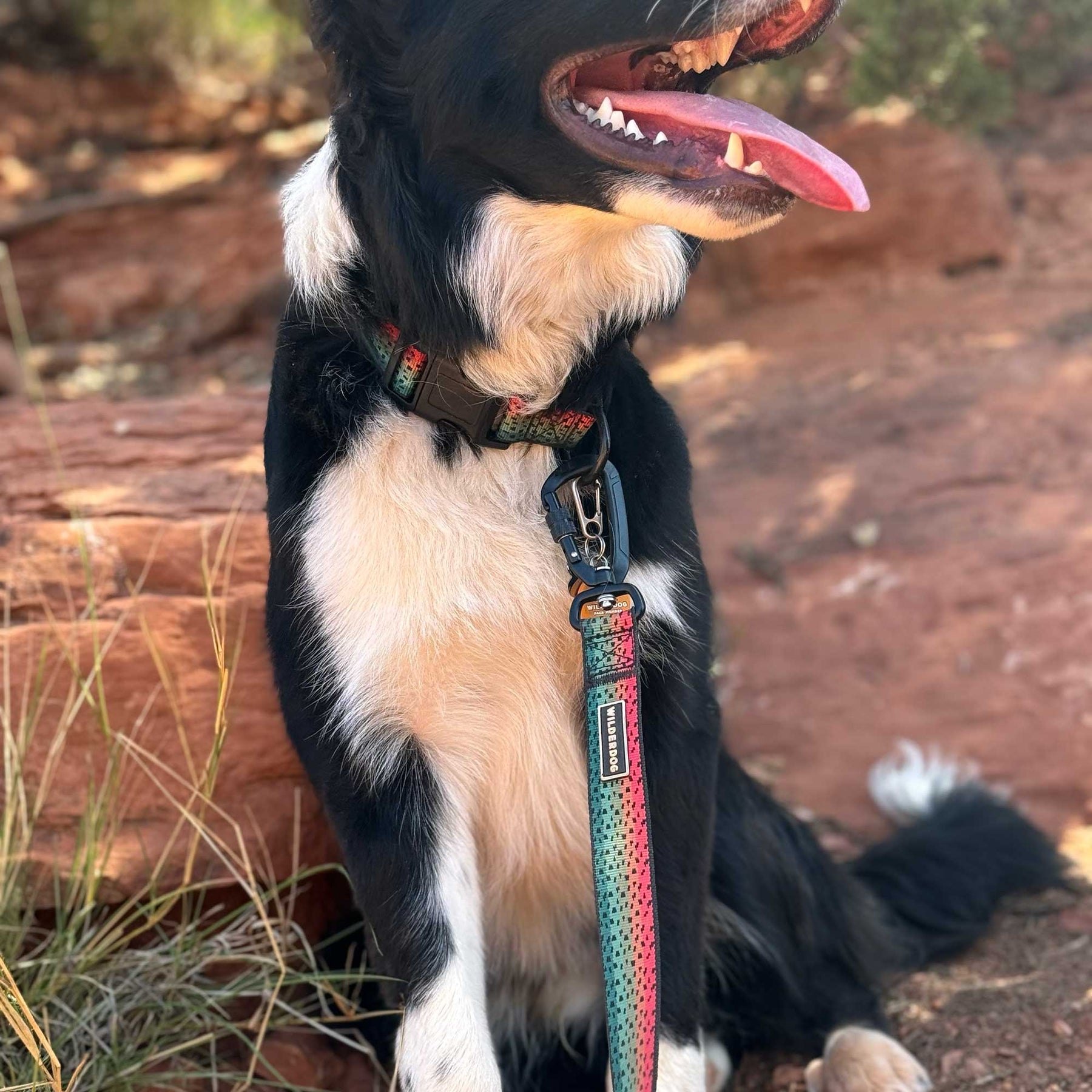 A black and white dog with a pink nylon webbing collar and a Trout Ultralight Leash, featuring an aluminum carabiner, sits on reddish rocky ground. The dog is panting with its tongue out, looking content. Grasses and a blurred natural background suggest an outdoor setting.