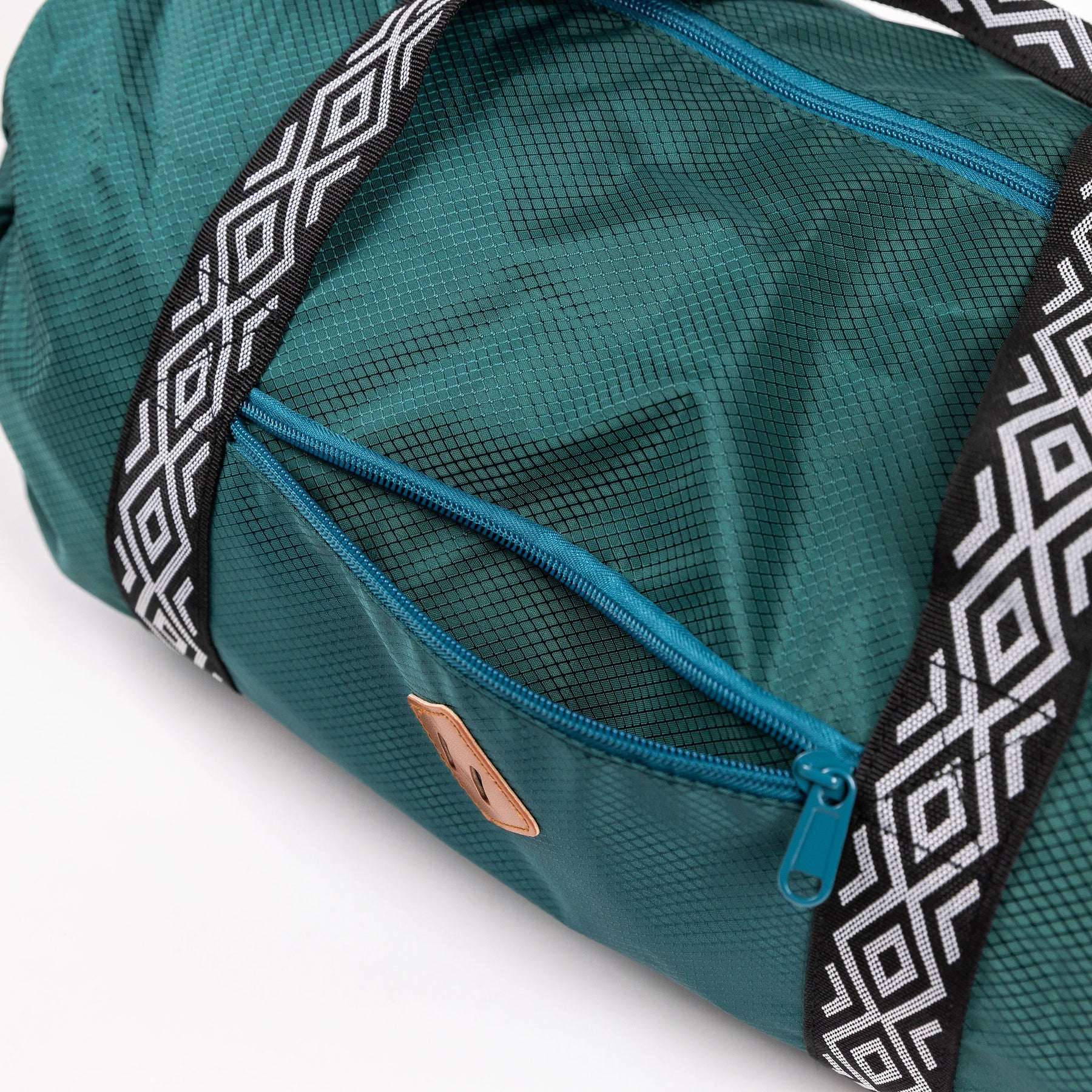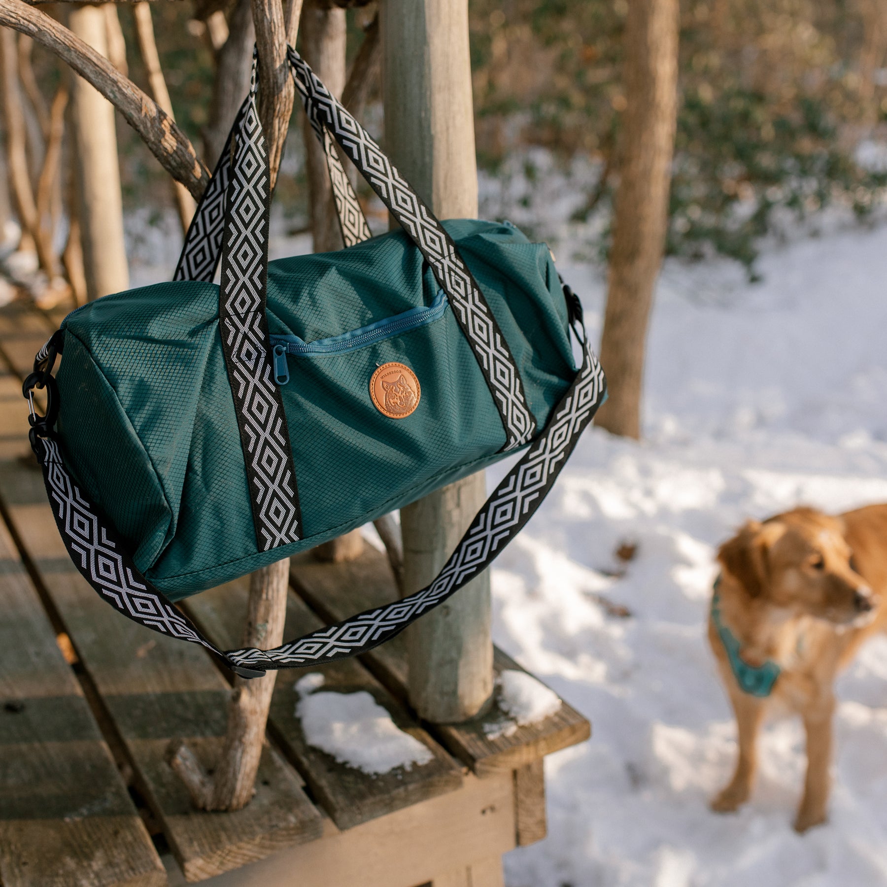 Close-up of the Dog Duffel, a teal duffel bag with a zippered pocket. Crafted from durable ripstop polyester, it showcases black and white geometric patterned straps and a small leather accent near the zipper. The water-resistant material is slightly textured. The background is plain white.