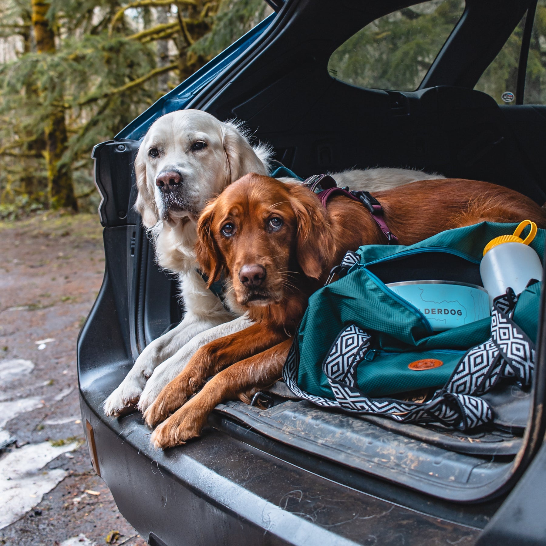 Two dogs, one golden retriever and one reddish-brown retriever, lie in the open trunk of a dark blue vehicle. Nestled beside them are a Dog Duffel made of durable turquoise ripstop polyester and a yellow dog water bottle. The scene is set outdoors with green trees in the background.
