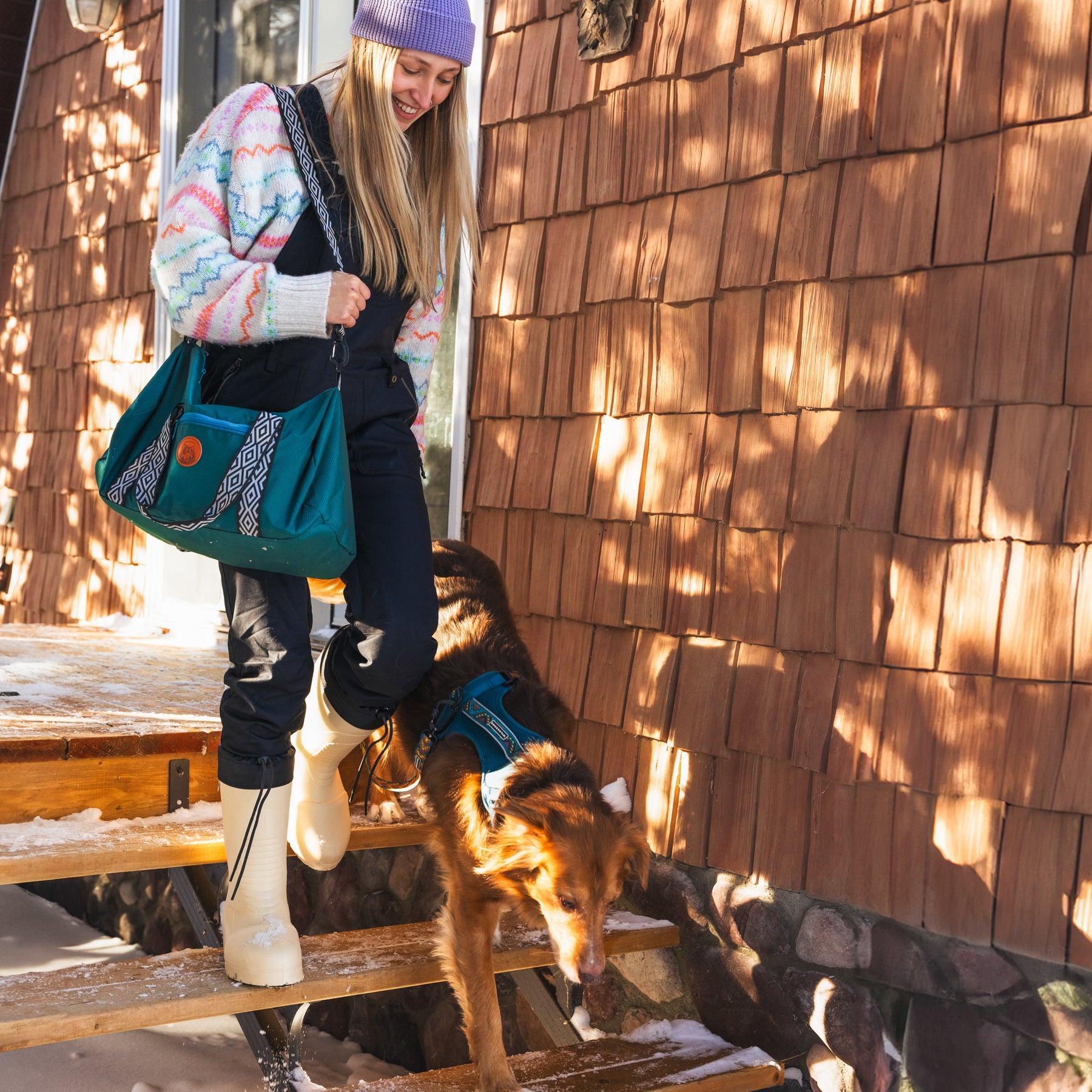 A woman with long blonde hair, wearing a colorful sweater, black pants, white boots, and a purple beanie, carries her Dog Duffel while walking down wooden steps with her brown dog. The steps lead from a wooden shingle house and there is some snow on the ground.