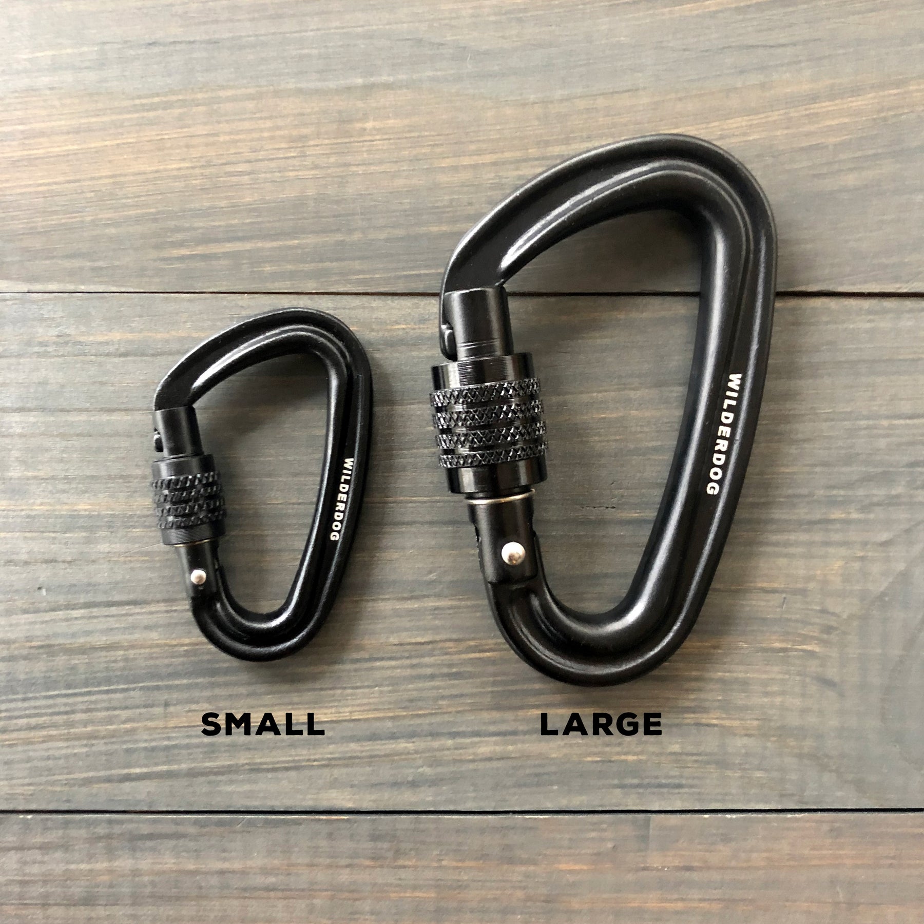 Two black metal carabiners, "SMALL" and "LARGE," on a wooden surface, branded "WILDERDOG."