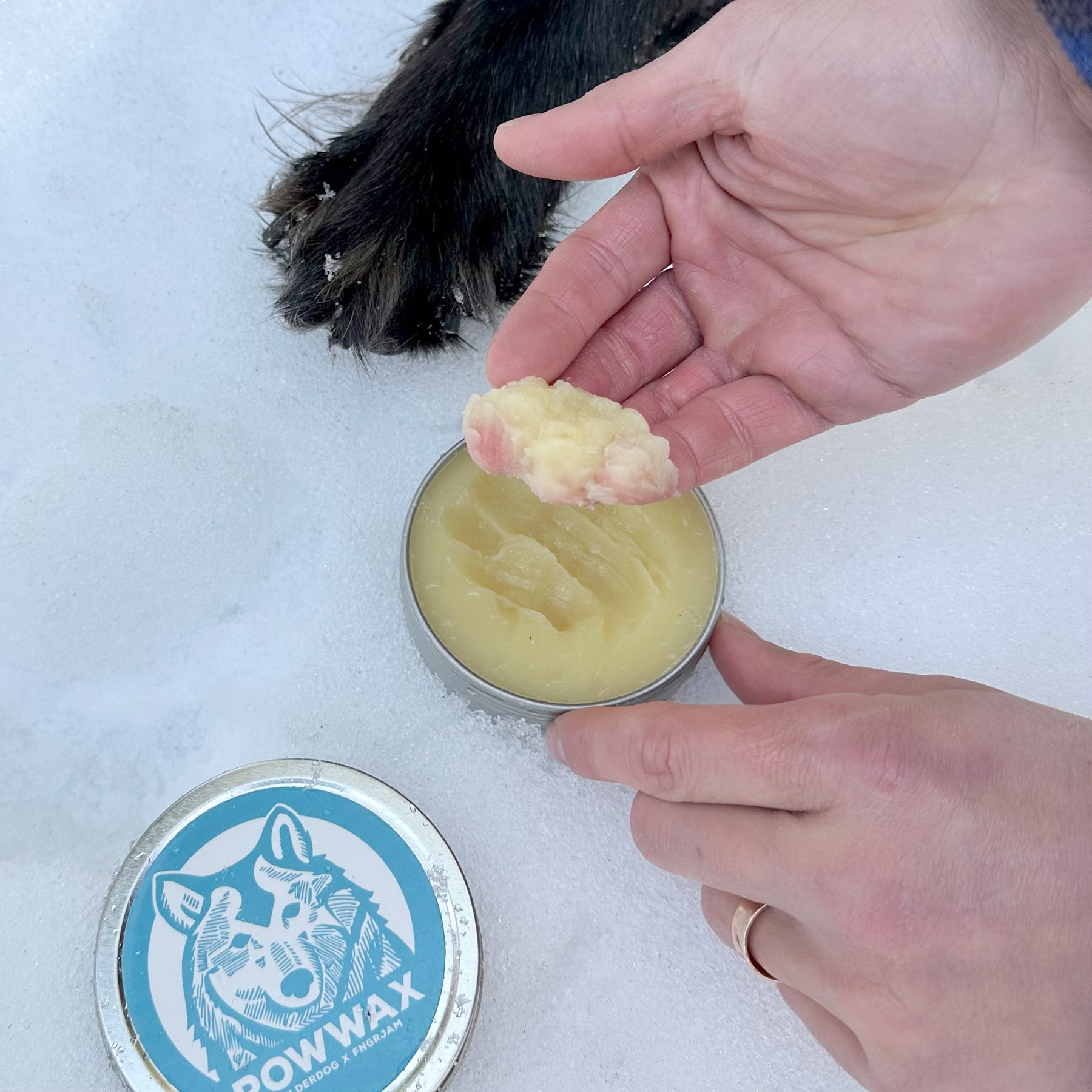 Fur-snow-balls, no more! POWWAX is an all-natural wax for your snow-loving dogs, specifically, long-furred, snow-loving dogs. Generously apply POWWAX before heading out in the snow to prevent the dreaded ice and snow balls that form between toes, on tails, under bellies, and wherever else your dog gets snowballs. POWWAX is a collaboration project with our rock climber friends over at FNGRJAM.