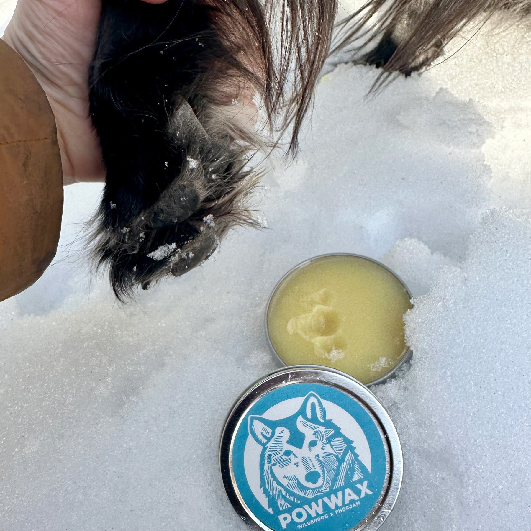 POWWAX is a blend of shea butter, jojoba oil, beeswax, carnauba wax, candelilla wax, calendula oil, and vitamin E. There may be trace smells of raw beeswax, which has a very neutral taste - dogs will not be tempted to lick it off! Should your dog lick the area anyway, POWWAX is non-toxic and safe. Non-greasy and does not stain floors or fabrics, but we'd advise applying right before heading out in the snow.