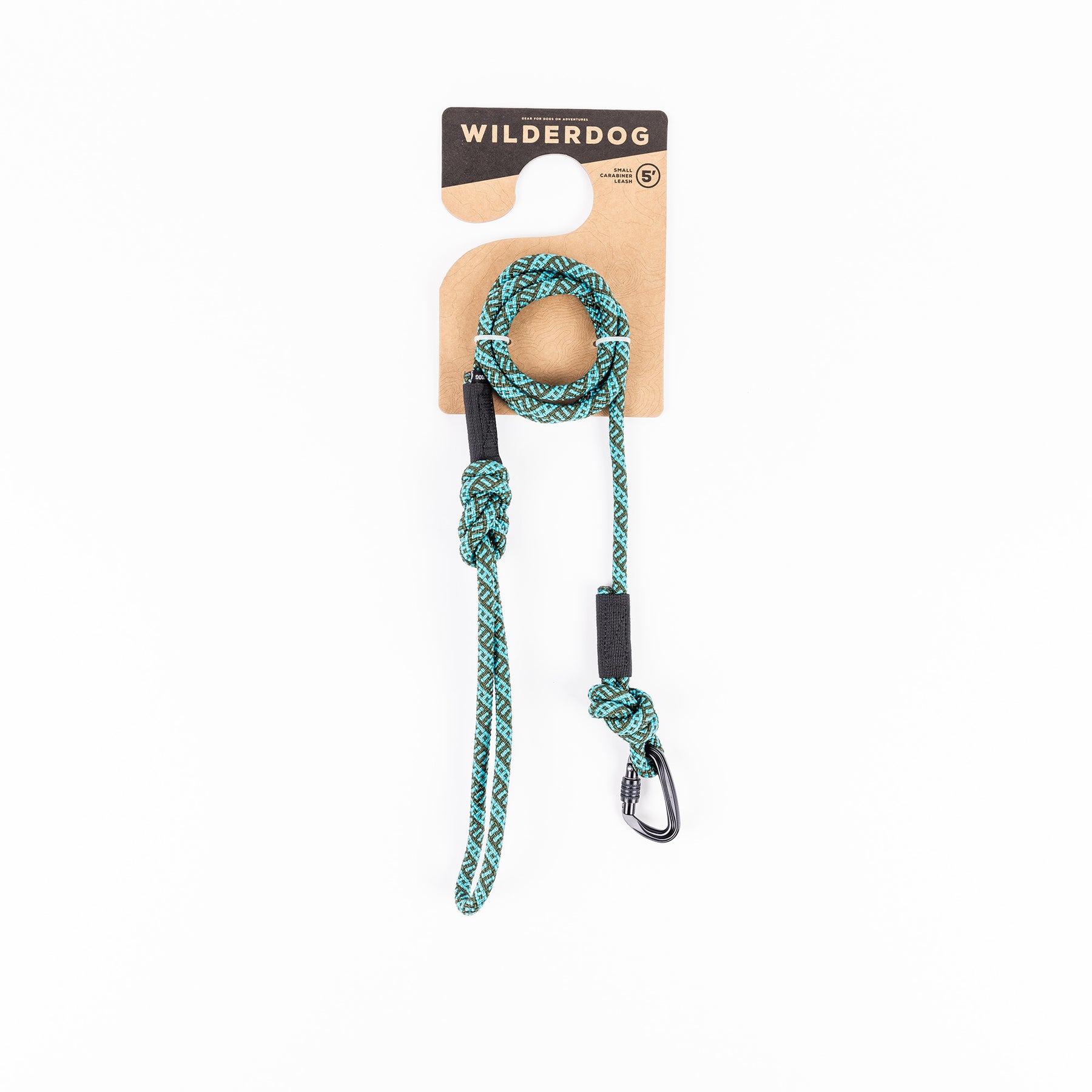 A green and white patterned Cascade Small Carabiner Leash from Smartcart21, crafted from durable rock climbing rope, is displayed against a white background. The leash is coiled and attached to a brown cardboard tag with the Smartcart21 logo at the top. A metal carabiner is attached at one end of this versatile dog leash.