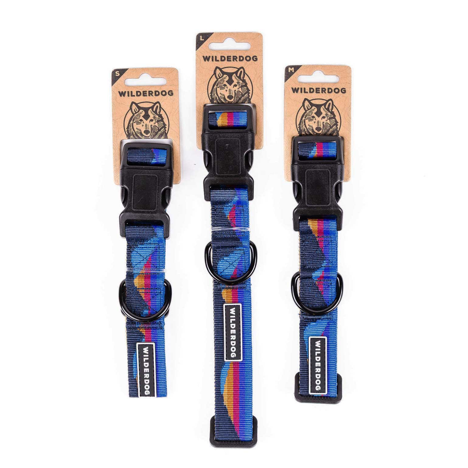 Three Cordillera Ultralight Collars in small, medium, and large are displayed upright in packaging. Each features ultralight nylon webbing with a blue multicolor design, a black heavy-duty plastic clip, and a metal D-ring.