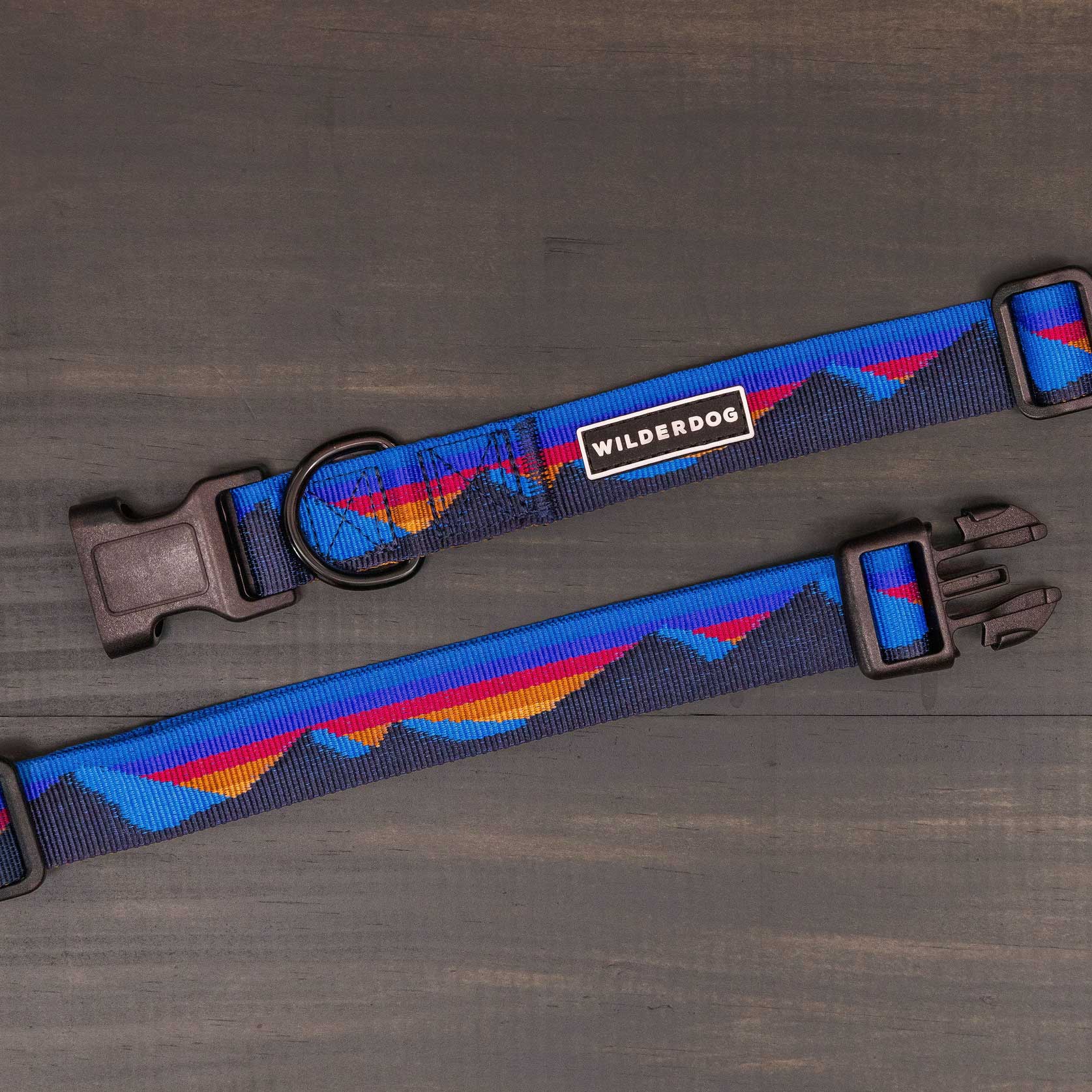 Two blue Cordillera Ultralight Collars with red and orange mountain patterns are displayed on a dark wooden surface. These collars feature strong nylon webbing, heavy-duty plastic clips, and adjustable straps.