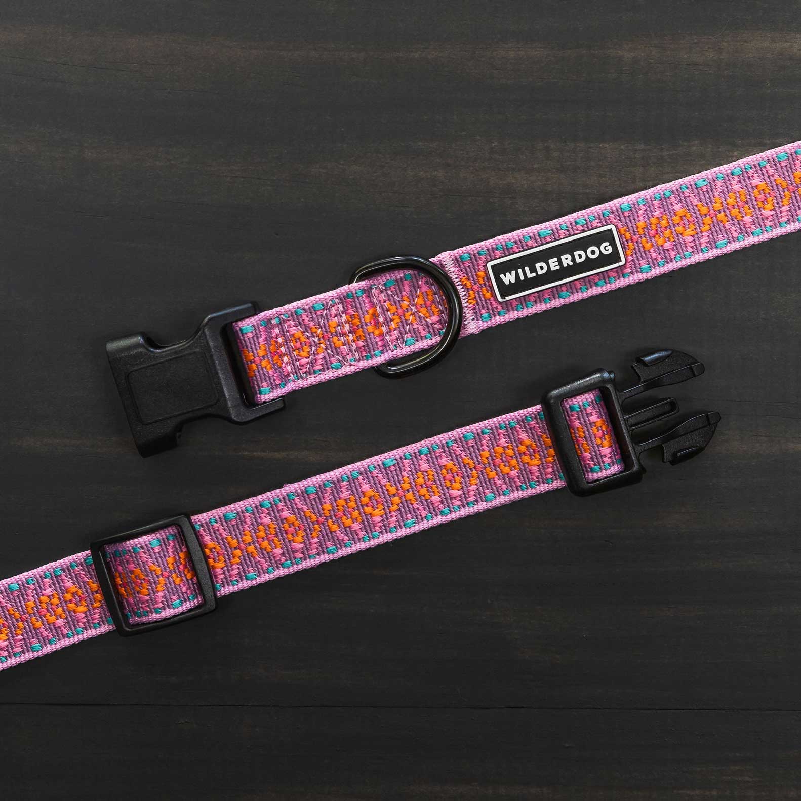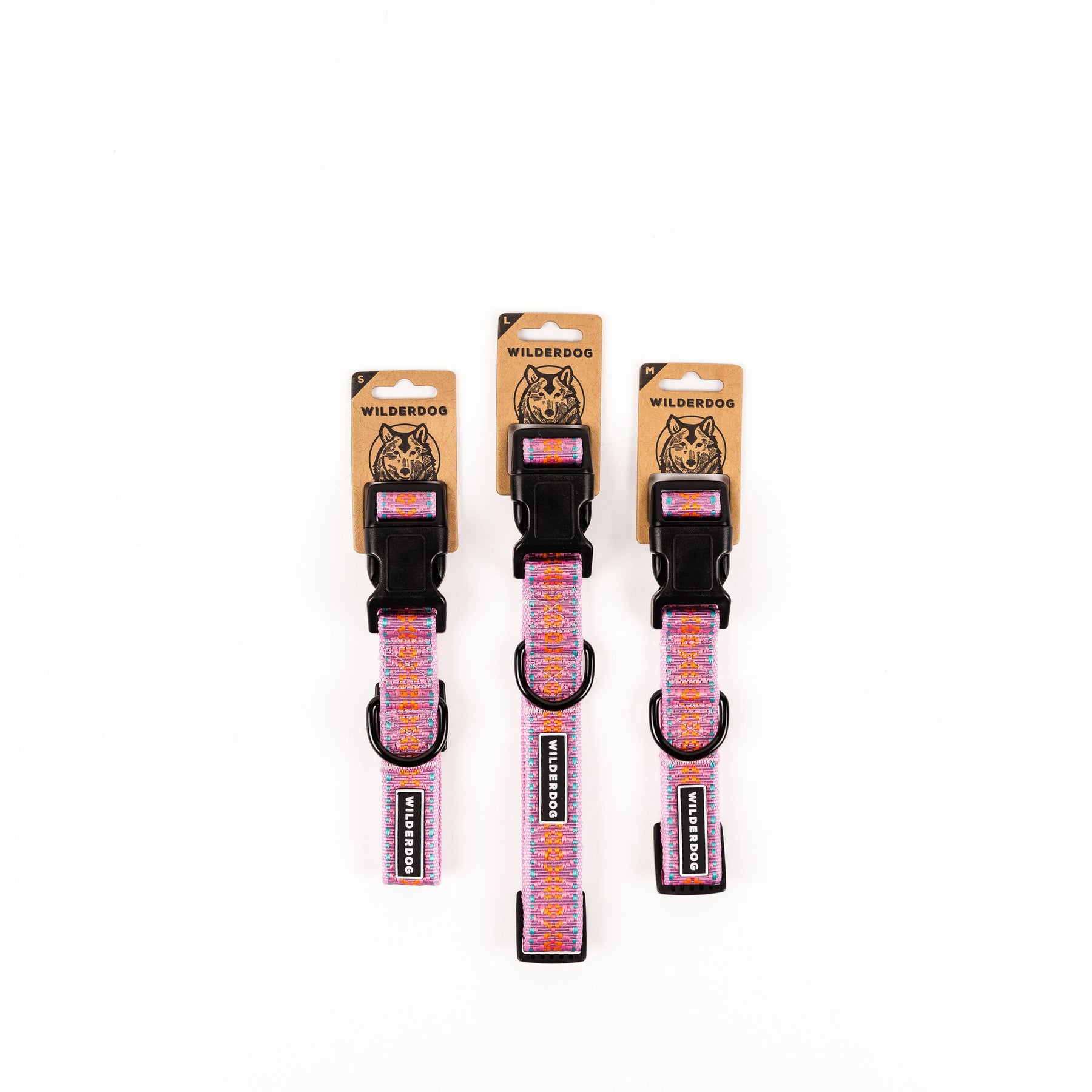 Lilac Ultralight Collar with red, blue, and pink pattern, black buckle, and "WILDERDOG" label.