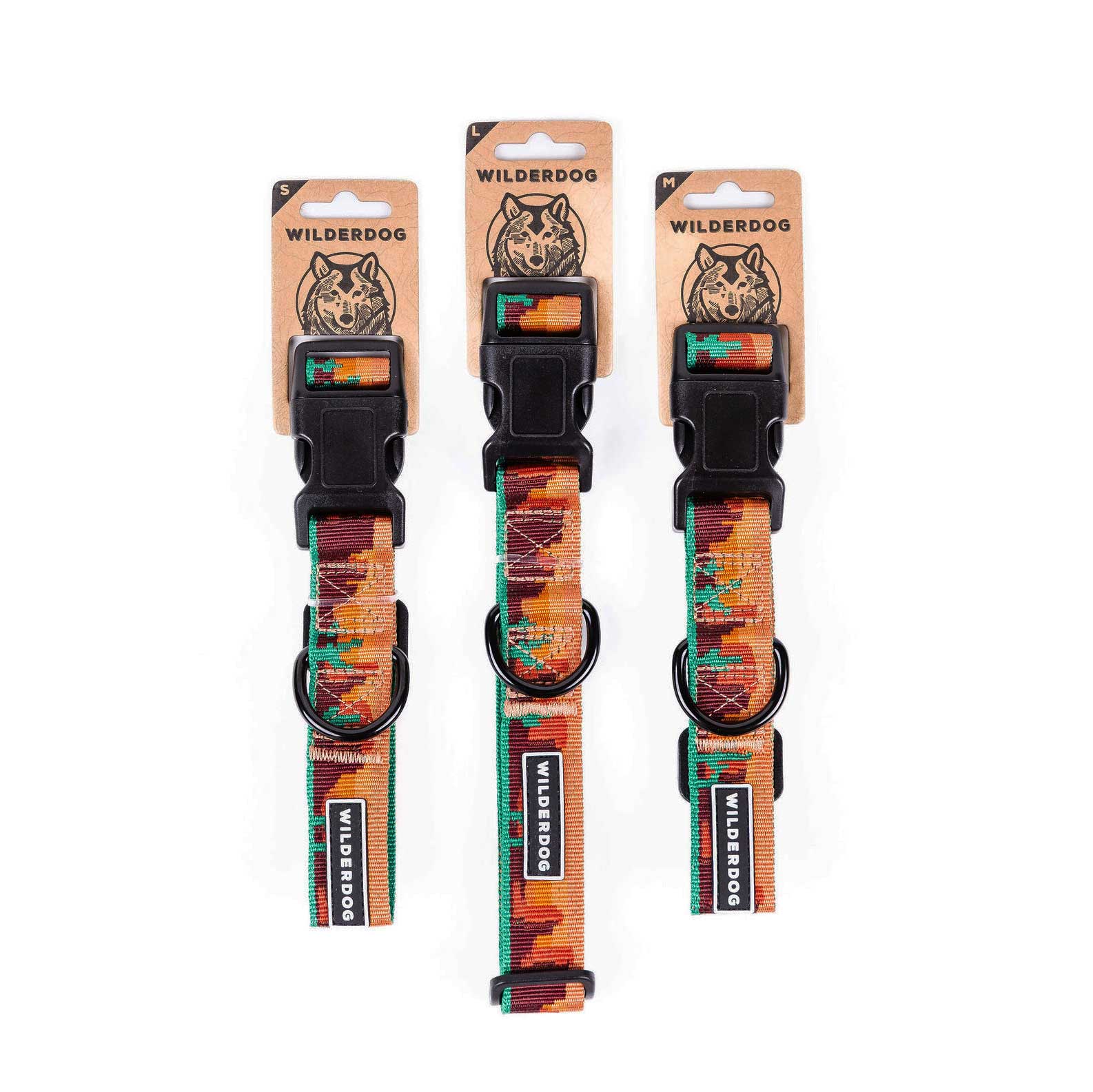 Two Moab Ultralight Collars with ultralight nylon webbing and a desert-inspired design in orange, brown, and green. Each features plastic buckles, a metal D-ring, "Wilderdog" label, and comes with a lifetime warranty.