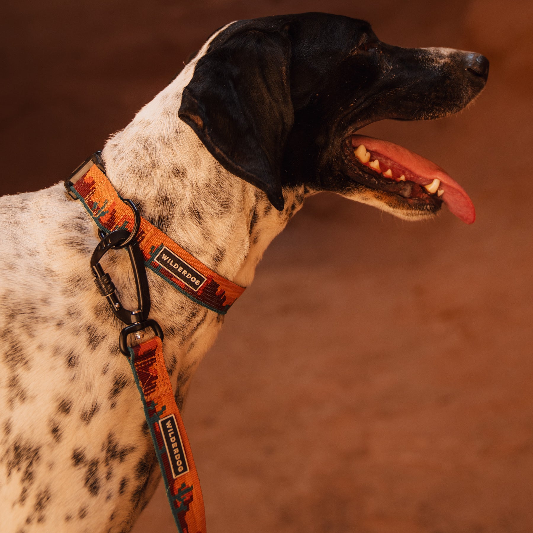 A black and white dog wears the Moab Ultralight Collar, featuring orange patterns and "Wildfor Dogs" branding. The nylon webbing stands out as the pup poses with its mouth open and tongue out against a warm, reddish brown background.