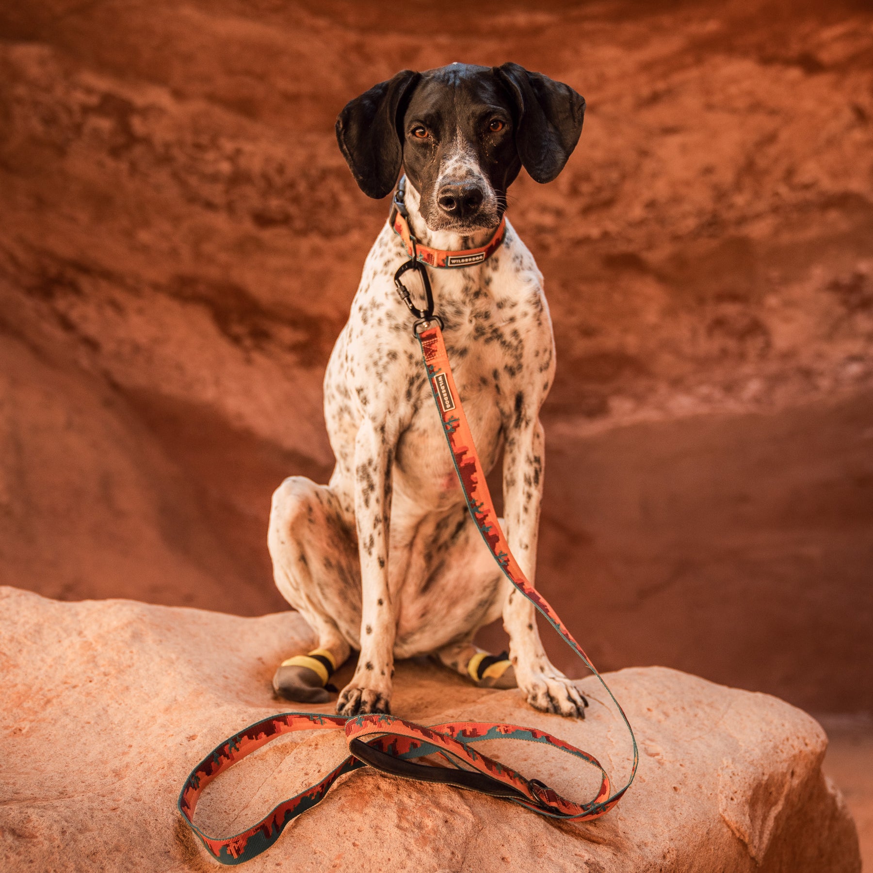A black and white spotted dog wearing a Moab Ultralight Collar, along with an orange leash and yellow booties, sits on a rock in a reddish canyon.
