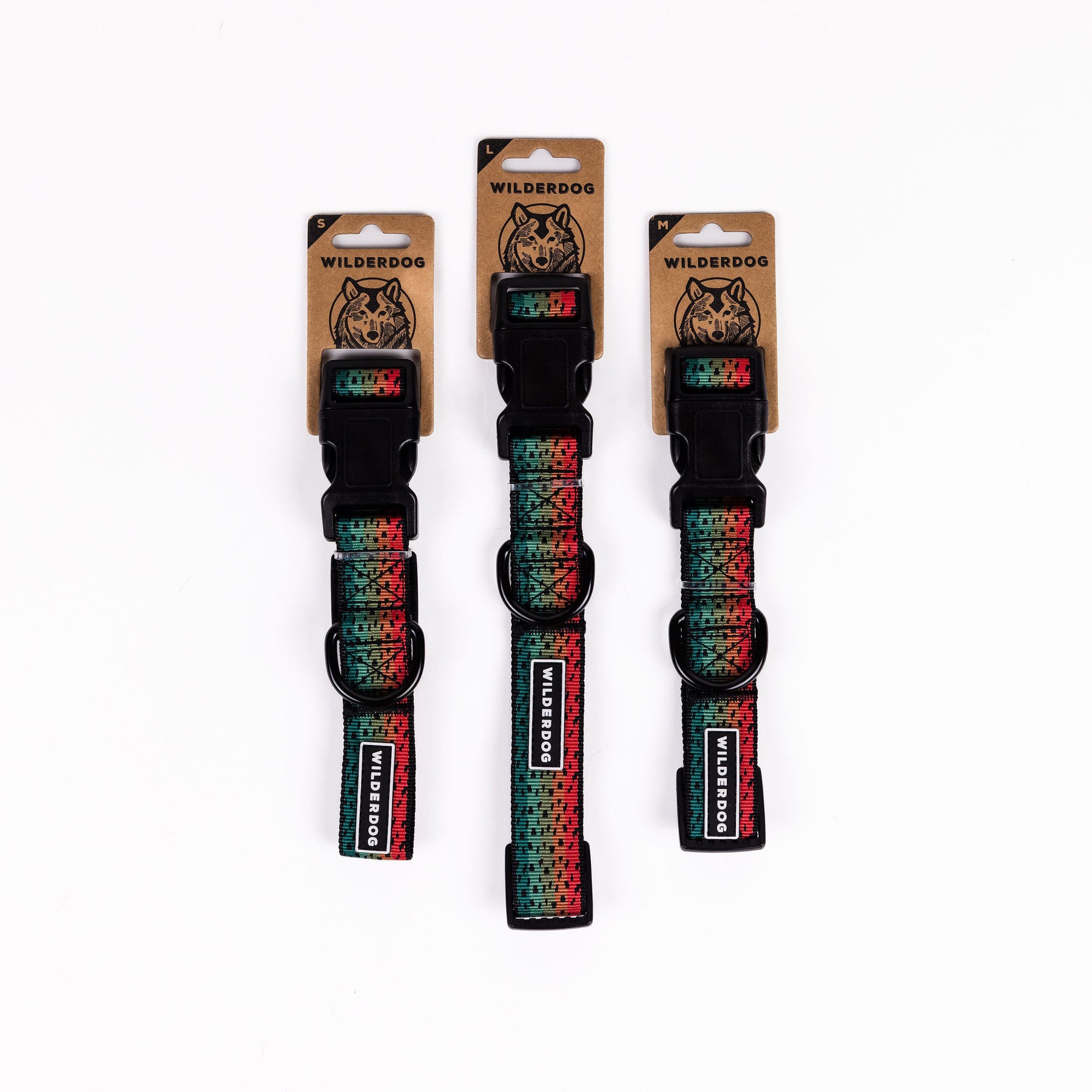 The Trout Ultralight Collar is a colorful dog collar with an adjustable strap, featuring a gradient pattern in shades of red, orange, green, and black. Part of the Ultralight Collection, it boasts a heavy-duty plastic clip and ultralight nylon webbing. The brand name "Wilderdog" is displayed on a white tag.