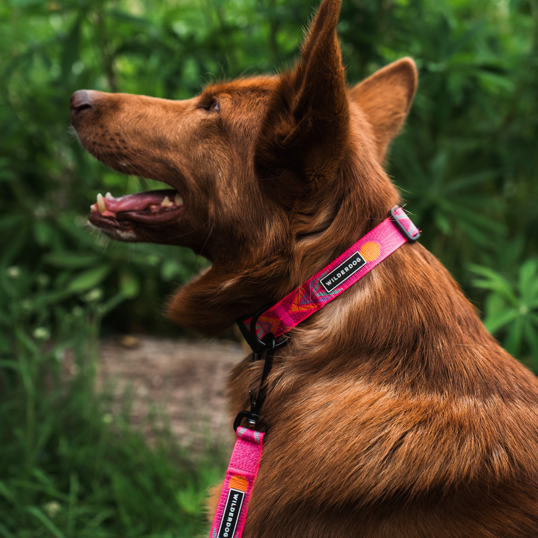A brown dog with upright ears wears a bright pink Playa Ultralight Leash and collar made from durable nylon webbing, standing outdoors against green foliage. The dog gazes left with its mouth open.