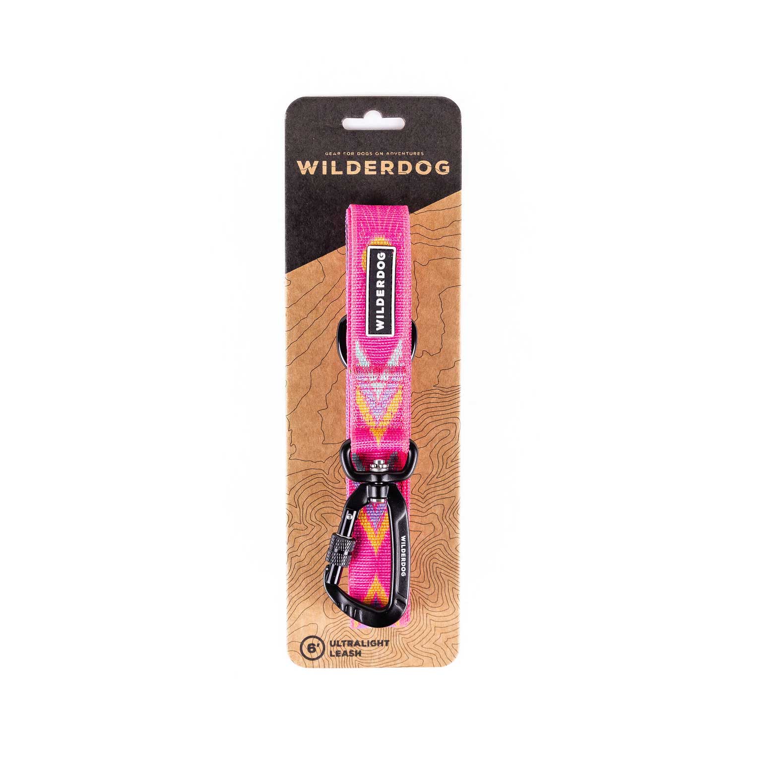 A Playa Ultralight Leash with a pink and yellow geometric pattern, made from durable nylon webbing, attached to branded packaging featuring a brown topographic map design and "Wilderdog" text at the top.
